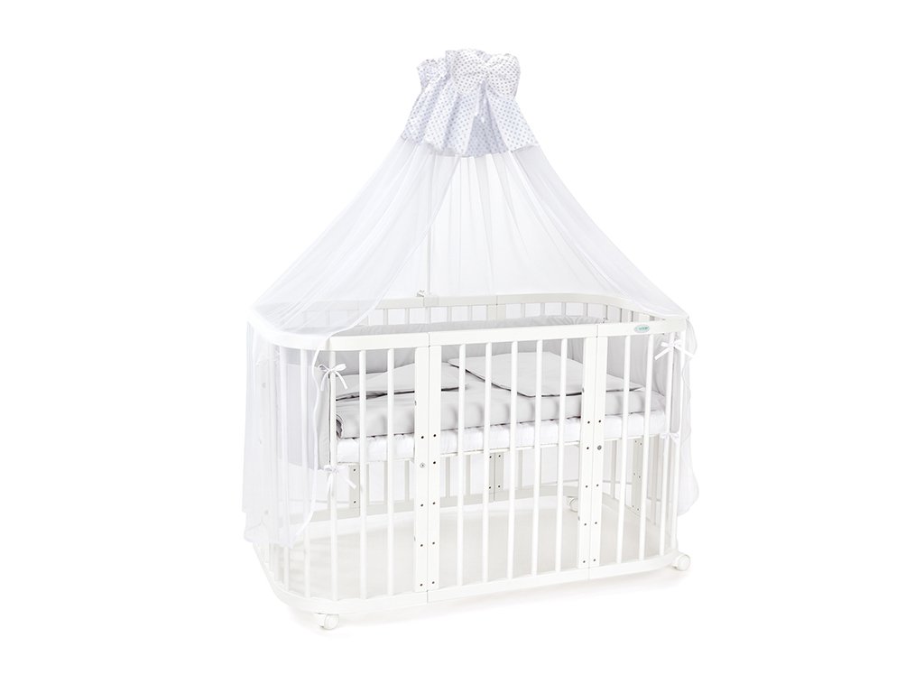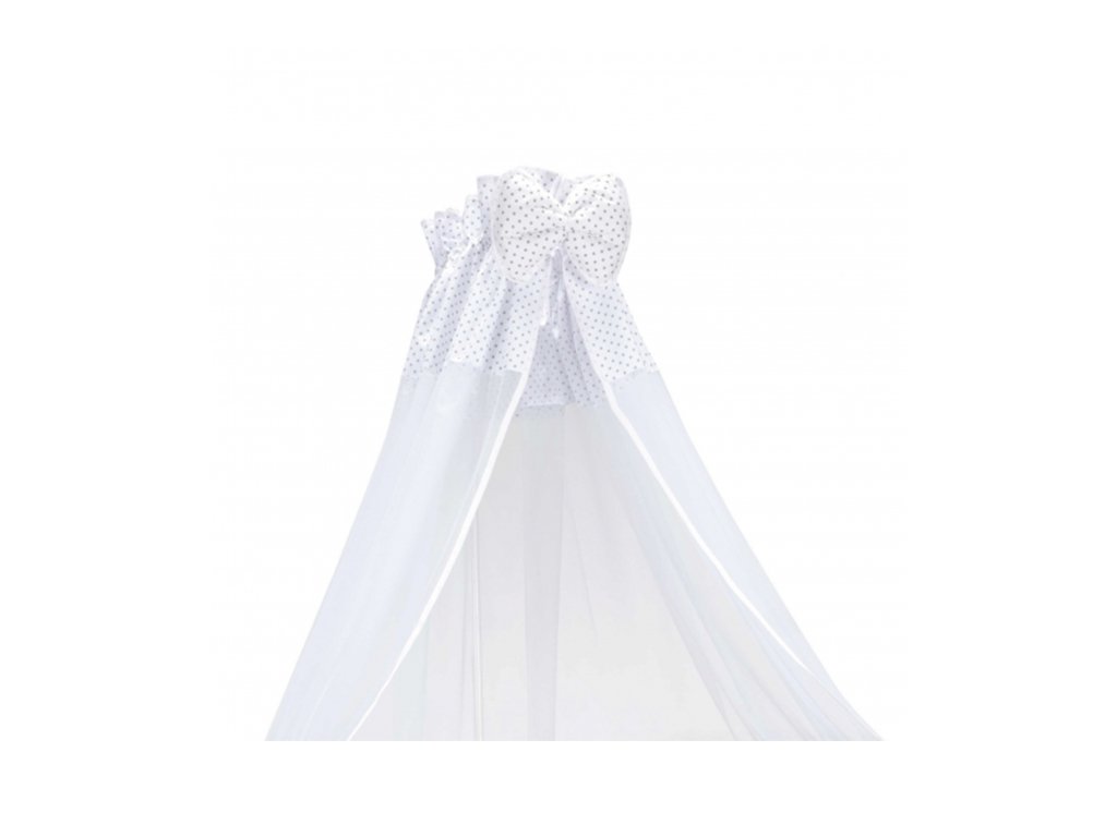 Biely baldachýn nad rastúcu postieľku 7v1 pomôže zútulniť prostredie, v ktorom bábätko spinká. Vrchná časť baldachýnu z bielej bavlny je ozdobená sivými bodkami a mašľou. Baldachýn je na stojane, ktorý sa k postieľke pripevní pomocou špeciálnych úchytov. Vyrobený z kombinácie 100 % bavlny a jemného priesvitného voálu. Baldachýn je dostupný v rôznych prevedeniach. Vyberte si farbu a potlač, aká sa vám páči.