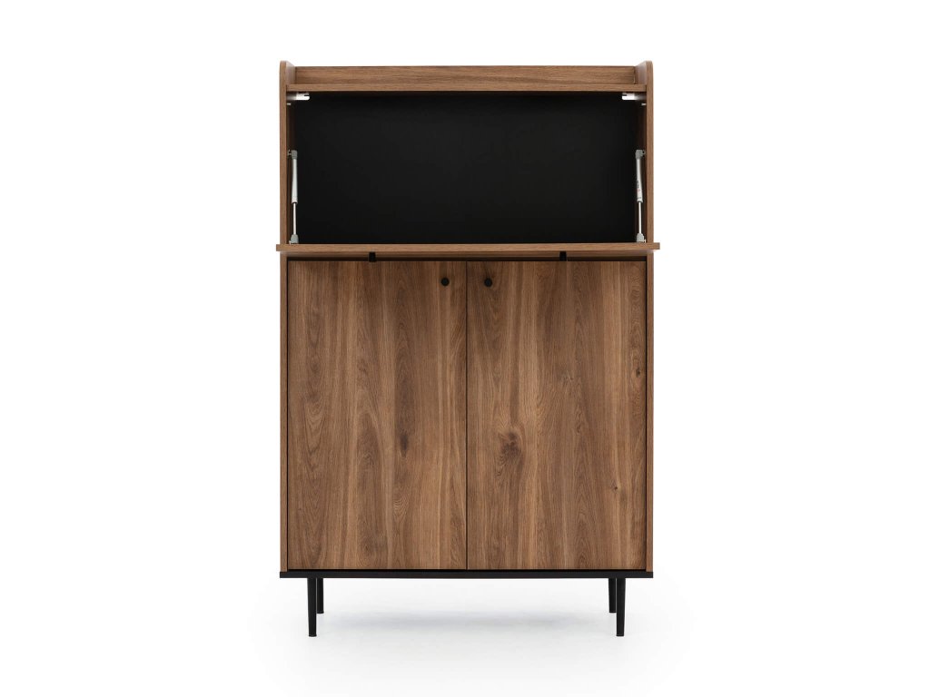 S čiernymi kovovými nožičkami, ktoré poskytujú dostatočnú stabilitu, si môžete byť istí, že vaše predmety budú v bezpečí. Vasina je vybavená čiernymi kovovými úchytmi, ktoré nielenže pridávajú šmrnc jej vzhľadu, ale zároveň uľahčujú otváranie skriniek a prístup k ich obsahu. V hornej časti komody nájdete vrchnú skrinku, ktorá slúži ako perfektné úložisko pre vaše obľúbené nápoje a občerstvenie, takže vždy budete pripravení na zábavné večery s rodinou a priateľmi. Pod týmto priestorom je dvojica skriniek s celkovo štyrmi policami, ktoré vám poskytnú dostatok miesta na uskladnenie pohárov, fľašiek či ďalších potrebných vecí.