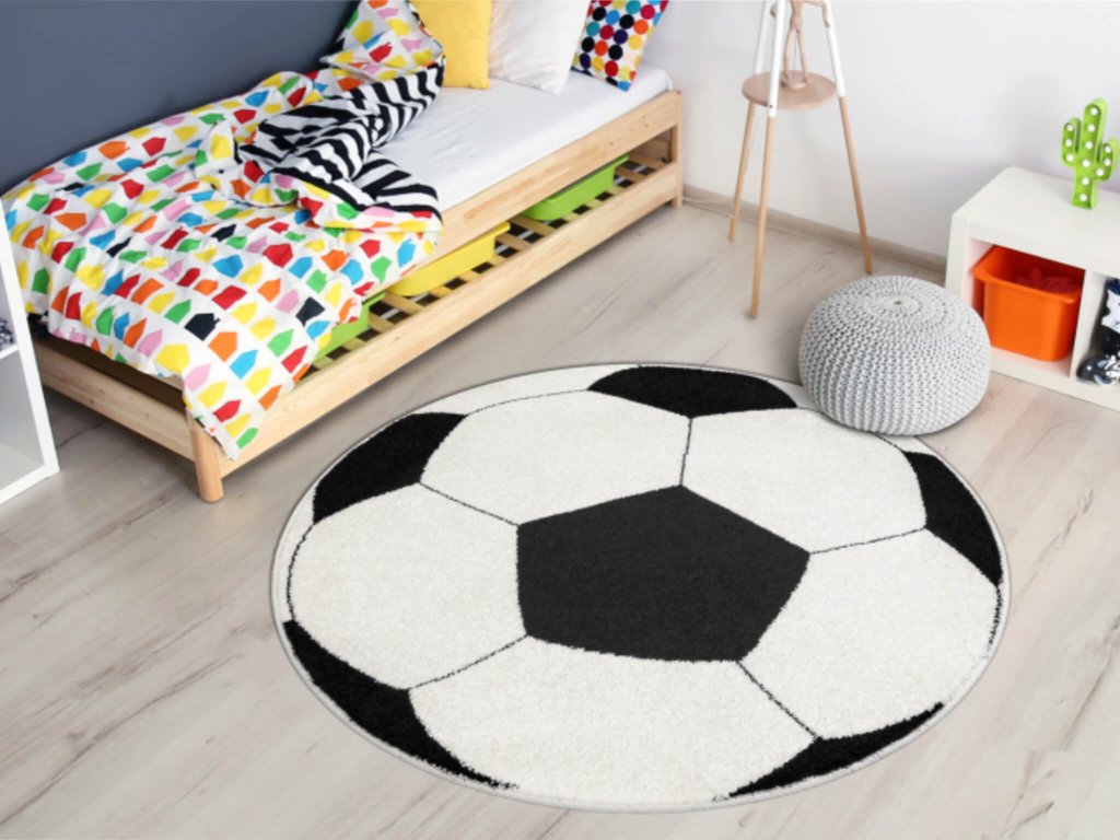Okrúhly koberec čiernobiela Lopta je určený pre deti do detských izieb. Každý milovník futbalu sa poteší kobercu, ktorý má dizajn lopty. Výška vlasu koberca je 10 mm je vhodný aj na podlahové kúrenie. Hustota vlákna je 2000 g/m2. Polypropylénové (PP) vlákna sú mäkké a pružné vďaka tepelnému spracovaniu a svojej perleťovej textúre pripomínajú ručne tkané koberce. V prípade čistenia koberca vám postačí vysávač alebo obyčajná mierne navlhčená handrička. Koberec sa vyznačuje certifikátom OEKO-TEX, to znamená, že všetky materiály sú bezpečné a nie sú zdraviu škodlivé pre vaše deti. Je k dispozícii vo viacerých rozmeroch.