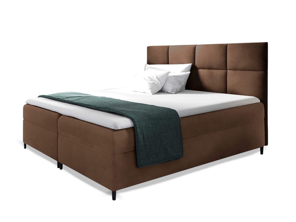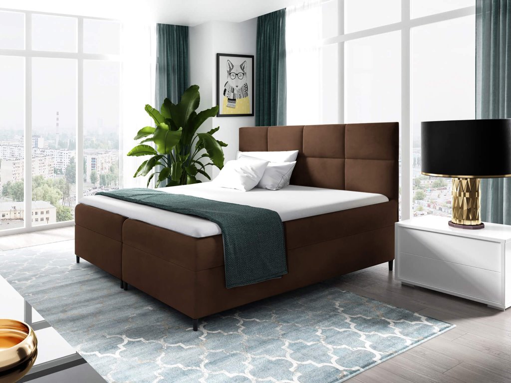 Kvalitná boxspringová posteľ je čalúnená nadčasovou látkou Magic velvet 2299. Poťahová látka je mäkká príjemná na dotyk a veľmi elegantná. Odolná proti oderu a nežmolkuje sa. Hnedý dizajn prepracovanej postele dodá spálni eleganciu. Matrace postele nie sú čalúnené jednou látkou, vrchná látka matraca nie je v rovnakej farbe ako posteľ.