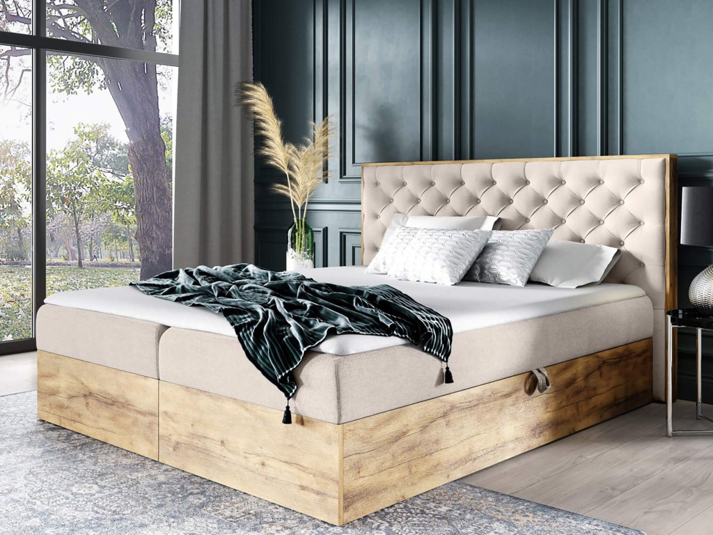 Čalúnená boxspring manželská posteľ s úložným priestorom WOOD 3 - béžová Paros