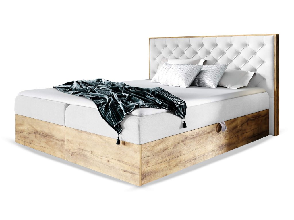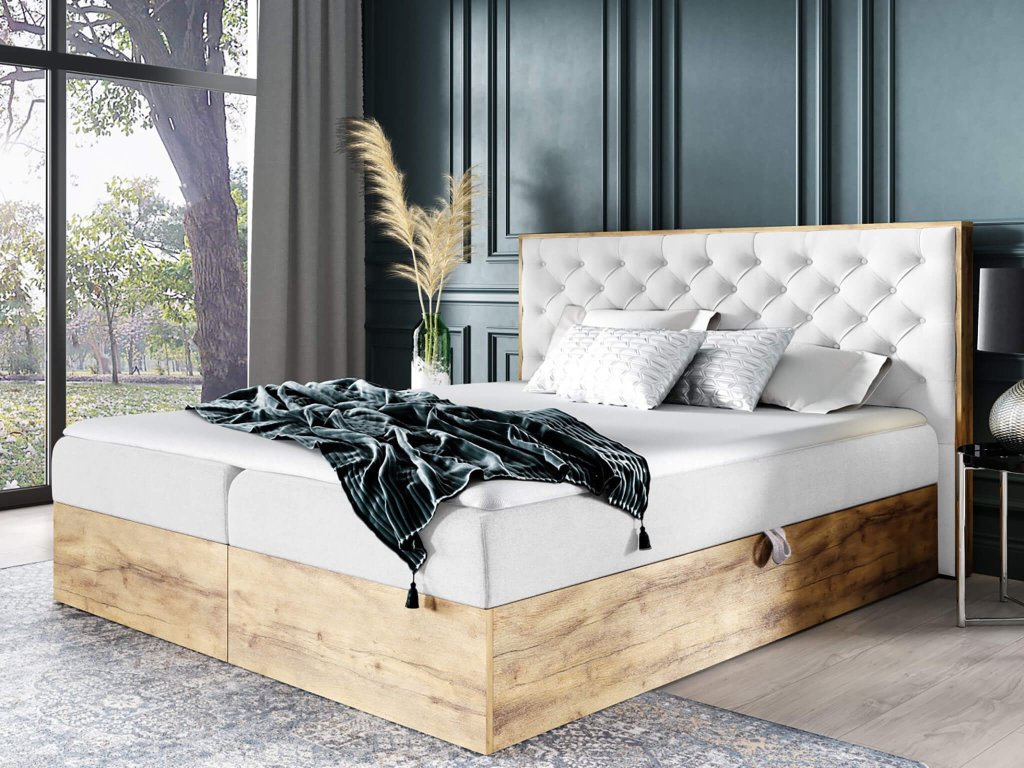 Čalúnená boxspring manželská posteľ s úložným priestorom WOOD 3 - biela Paros