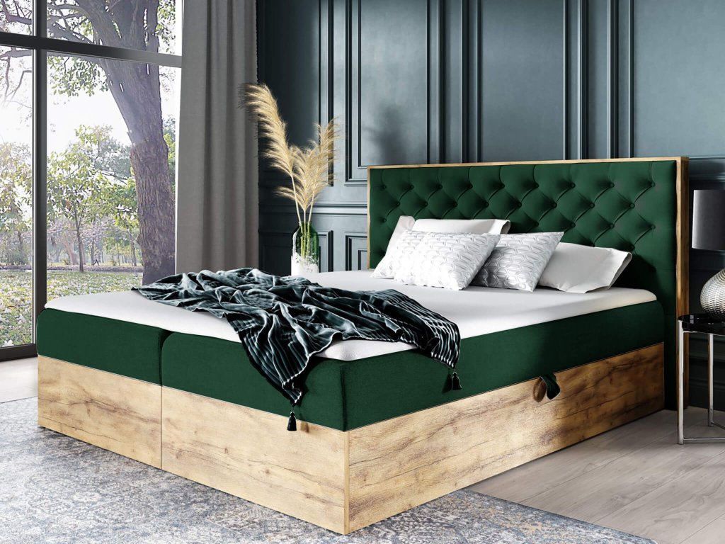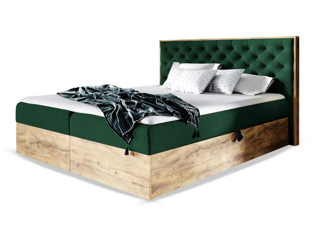 Čalúnená boxspring manželská posteľ s úložným priestorom WOOD 3 - zelená Kronos
