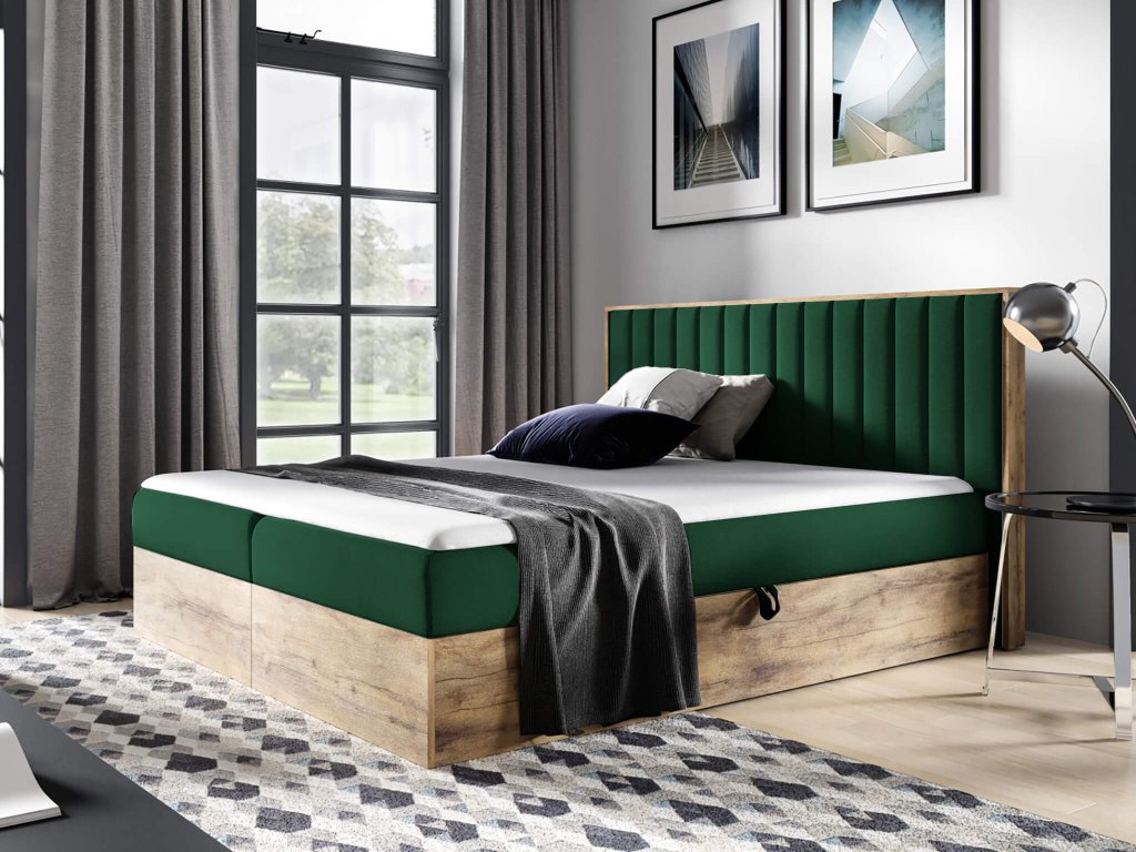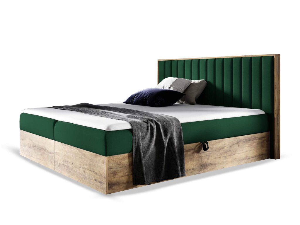 Čalúnená boxspring manželská posteľ s úložným priestorom WOOD 4 - zelená Kronos