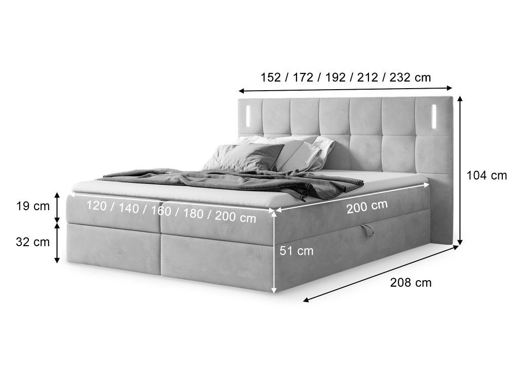 Ak hľadáte ideálne riešenie do vašej spálne, Dancer bude tým správnym výberom. Očarí vás funkčnosť aj elegantný dizajn. Poste v 4 rozmeroch ideálne doplní nábytok v modernom aj klasickom interiéri. Boxspring posteľ vyniká úložným priestorom, ktorý využijete po každej stránke. Posteľ disponuje vlastným roštom a kvalitným matracom. Pružinový matrac je vyrobený z kvalitnej peny T-25 a Bonell pružín. Tieto pružiny sú známe pre svoju pevnosť a vysoké zaťaženie. Vysoká čalúnená posteľ je vhodná aj pre ľudí so zdravotnými problémami. K posteli dodávame aj vrchný matrac (Topper) vysoký 5 cm. Je vyrobený z peny T-25. Vrchný matrac dodá posteli mäkkosť a elasticitu. Vrchný matrac má odnímateľný poťah, ktorý je možný prať v práčke na 30 °C. Moderný vzhľad posteli dodáva prešívanie na čele pri hlave. Vďaka tomu dodá interiéru moderný vzhľad. Vysoké čelo poslúži pri večernom relaxe. Zadná časť čela nie je čalúnená vo farbe postele. Posteľ okrem perfektného dizajnu disponuje aj úložnými boxami, ktoré sa otvárajú z bočných strán postele s jednoduchým pružinovým systémom.