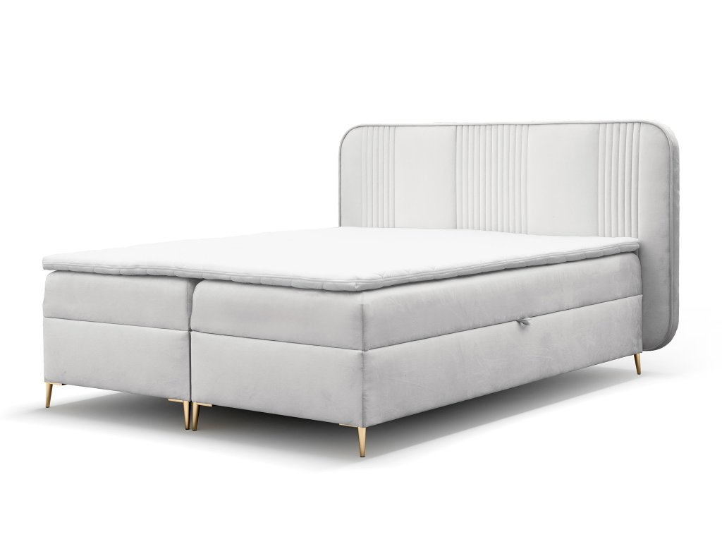 V konštrukcii nájdete hlavný matrac s bonellovými pružinami a penou T25 s tvrdosťou H3, ktorý poskytuje stabilný a pohodlný pocit pri ležaní. O ešte mäkší a rovnomernejší povrch sa stará vrchný matrac z peny T25 s výškou 4 cm. Celá posteľ je potiahnutá látkou Magic Velvet v svetlosivej farbe – ide o matnú, zamatovú textíliu, ktorá je extrémne odolná, nehorľavá, nepremokavá a odolná proti poškriabaniu, čo ocenia najmä domácnosti so zvieratami.