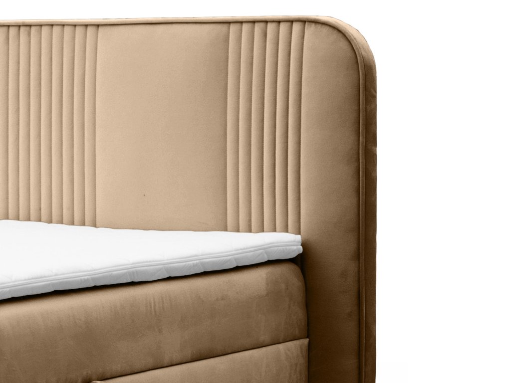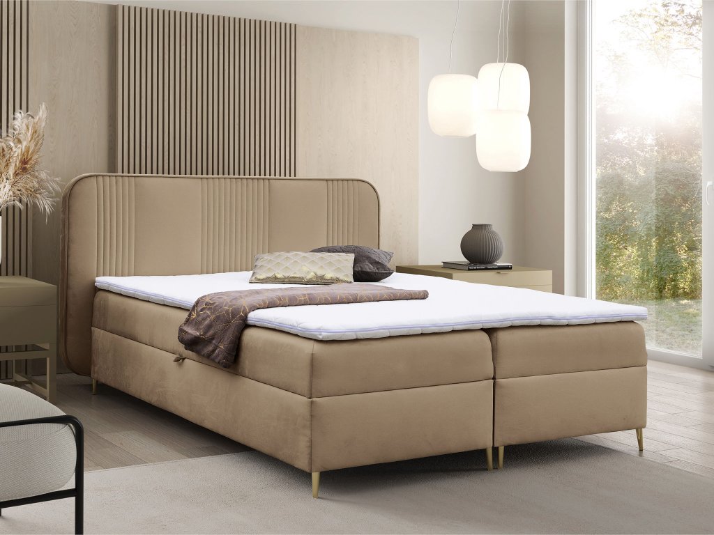 Nosnú časť postele tvorí pevná kombinácia drevených prvkov a odolných dosiek, čo zvyšuje stabilitu a predlžuje jej životnosť. Zadné čelo je doplnené o borovicovú výstuž, mäkkú penu T25 a jemnú tkaninu, takže pri čítaní alebo relaxe poskytuje príjemnú oporu. Vzhľad postele dotvárajú 15 cm vysoké kovové nožičky v zlatej farbe a decentne prešívaný povrch, ktorý dodáva celku osobitý charakter. Súčasťou vybavenia je pružinový matrac s bonellovým systémom a vrstvou peny T25 v tvrdosti H3, ktorý zabezpečuje stabilné podopretie tela. Pre jemnejší pocit pri ležaní je doplnený o 4 cm vysoký topper z rovnakej peny. Poťah tvorí látka Magic Velvet v svetlohnedom odtieni – ide o mäkký, zamatový materiál s matným efektom, ktorý výborne odoláva oderu, nevsakuje tekutiny, je nehorľavý a vďaka svojej odolnosti sa hodí aj do domácností so zvieratami.