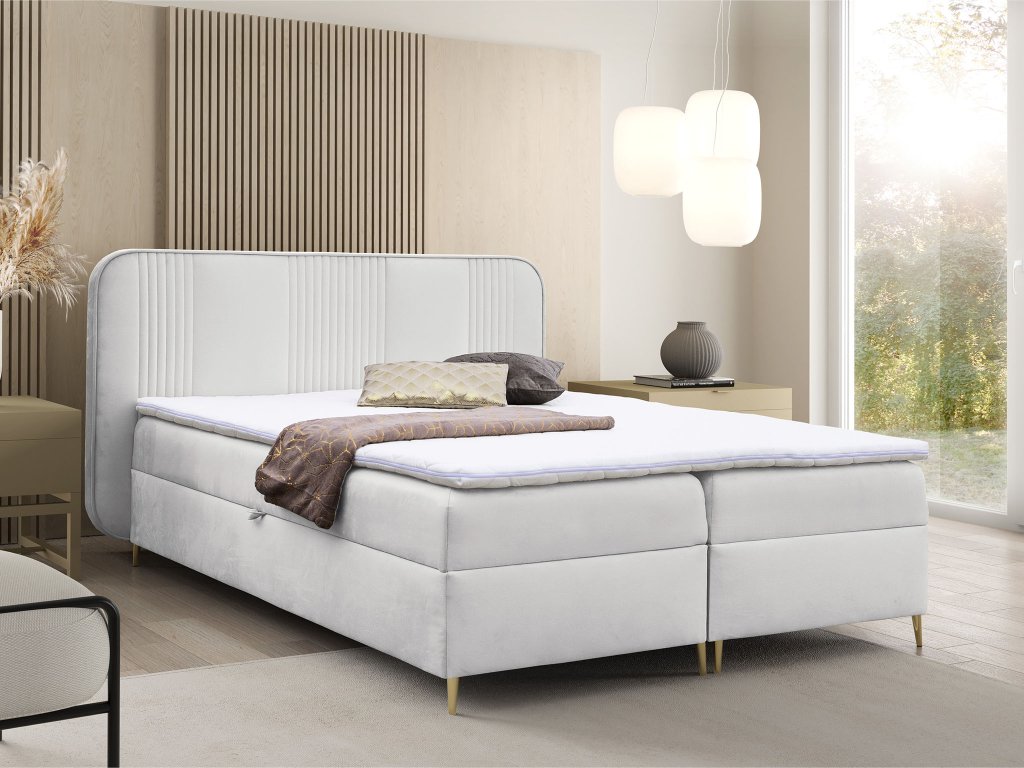 Konštrukcia postele je vytvorená z odolnej kombinácie masívnych drevených komponentov a kvalitných dosiek, čo garantuje stabilitu počas dlhoročného používania. Čelová doska je vystužená borovicovým rámom, doplnená penou T25 a mäkkou textíliou – vďaka tomu slúži ako pohodlná opora pri sedení či oddychu. Estetický dojem umocňujú zlaté kovové nohy vysoké 15 cm, ktoré posteľ opticky odľahčujú, a jemné prešívanie pridávajúce na elegancii. Súčasťou zostavy je aj hlavný matrac s bonellovými pružinami a vrstvou peny T25 v tvrdosti H3, ktorý poskytuje pevnú podporu tela počas spánku. O mäkší pocit pri ležaní sa stará 4 cm topper z rovnakého penového materiálu. Poťahová látka Magic Velvet v svetlosivej farbe dodáva posteli sofistikovaný vzhľad. Ide o hebký zamatový textil s matným povrchom, ktorý je odolný voči poškriabaniu, neprepúšťa tekutiny, nehorí a svojimi vlastnosťami je vhodný aj pre majiteľov domácich zvierat.