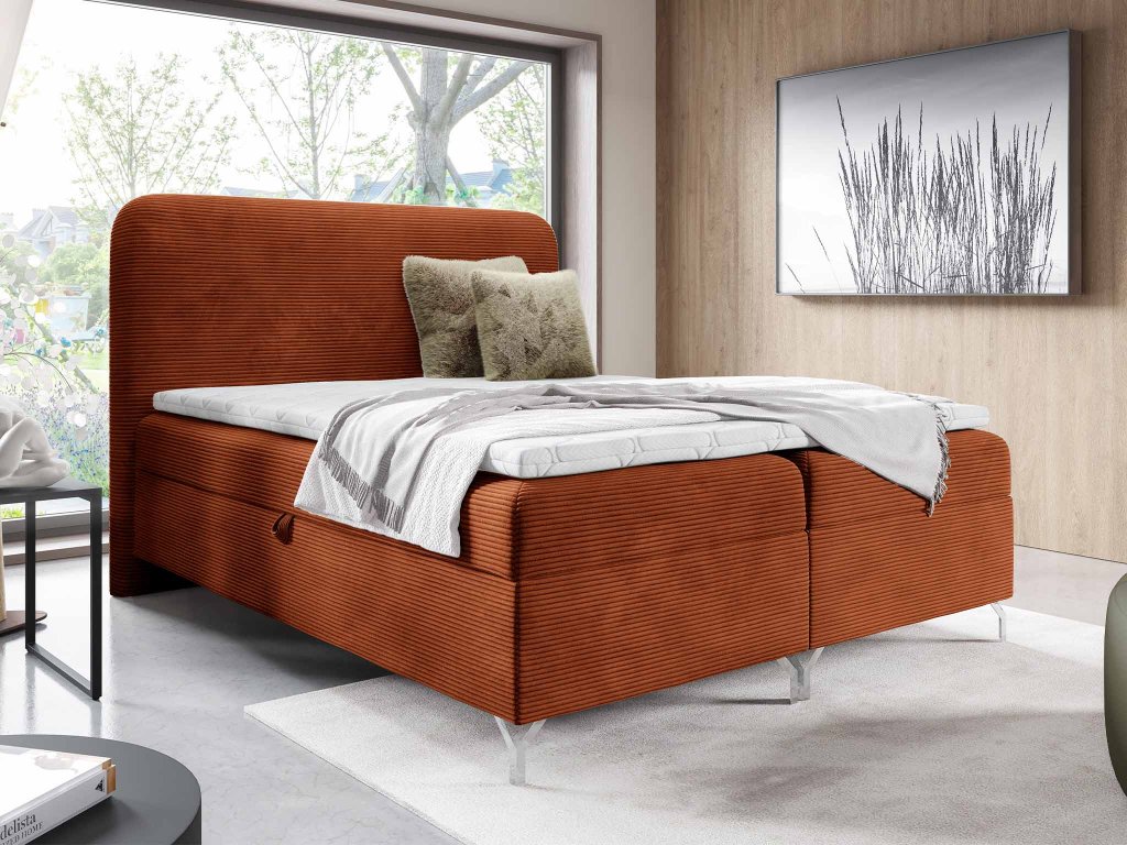 Nadčasová manželská posteľ 200x200 Gomez v tehlovej farbe prinesie do interiéru výrazný akcent, ktorý pôsobí moderným a zároveň útulným dojmom. Tehlový odtieň je originálny, no stále dostatočne univerzálny na kombinovanie s drevom, neutrálnymi farbami či kontrastnými doplnkami. Čalúnené čelo potiahnuté látkou Poso s jemnou menčestrovou štruktúrou pôsobí štýlovo a pri večernom oddychu poskytne pohodlnú oporu chrbtu.