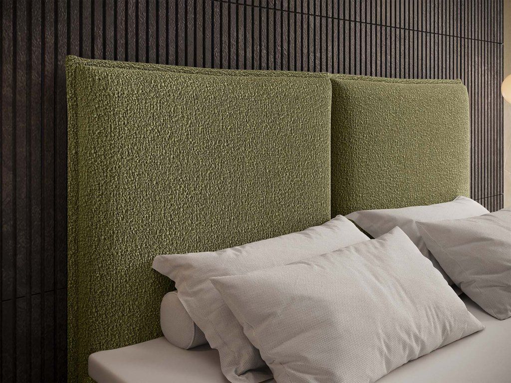 Dominantou postele Seleno je čalúnenie v látke Quelle (odtieň #38). Ide o tkaninu typu bouclé, ktorá je známa svojím špecifickým uzlíkovým povrchom. S gramážou 315 g/m² a vysokou odolnosťou voči oderu (až 90 000 cyklov Martindale) je táto boxspring posteľ stavaná na dlhoročné používanie bez straty kvality. Olivovozelená farba pôsobí upokojujúco a dodáva spálni potrebný nádych prírody a pokoja.