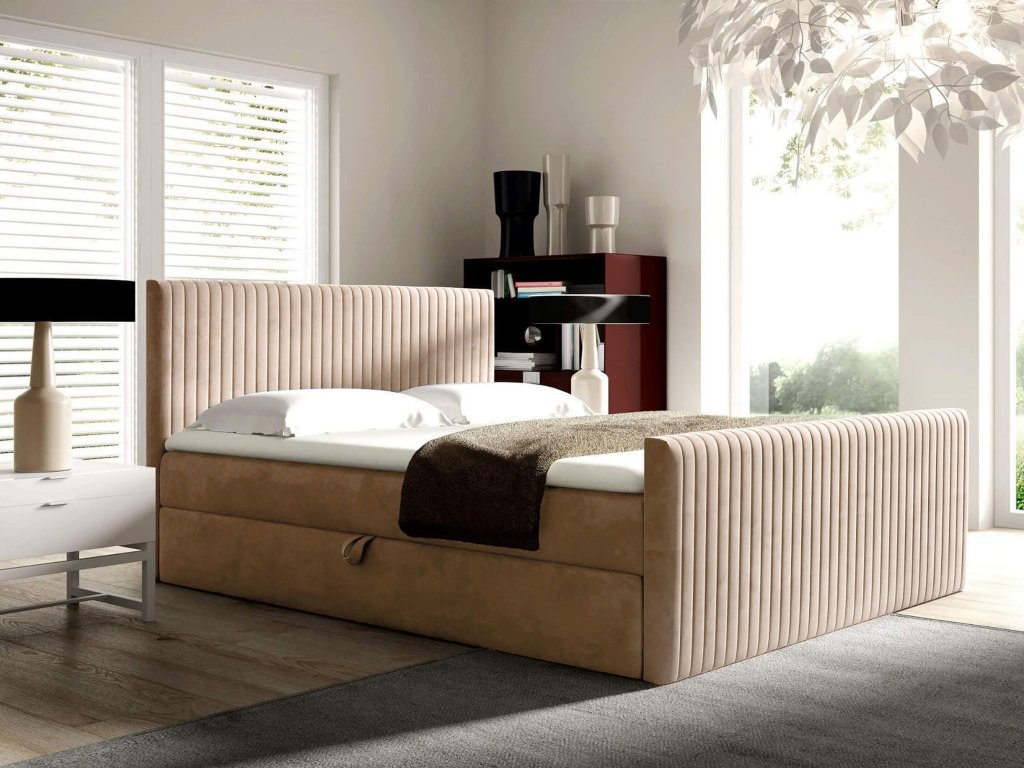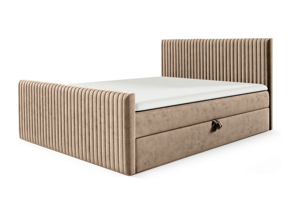Béžová boxspringová posteľ Polaris je ideálnym riešením pre elegantný a útulný interiér. Výrazné prešívanie na oboch čelách pridáva nádych luxusu, ktorý podčiarkuje zamatová látka Fresh 3, mimoriadne príjemná na dotyk. Matrac so systémom pružín bonell a elastickou penou T25 poskytuje optimálne pohodlie, doplnené 5 cm vysokým penovým topperom, ktorý je súčasťou postele. Praktický úložný priestor otvára pohodlný automatickýmechanizmus s úchytom, ktorý vám umožní efektívne využiť miesto v spálni. Manželskú posteľ Polaris je možné doladiť vhodným nočným stolíkom, komodou alebo závesom.