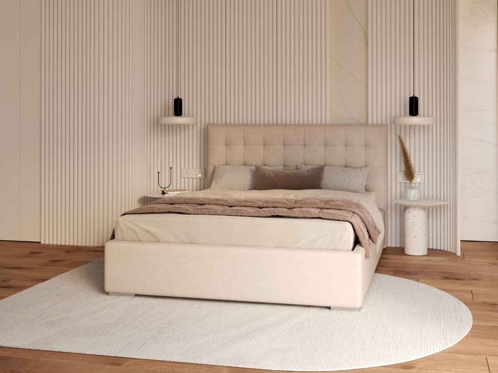 Poťah je vyrobený z kvalitnej látky Trinity, ktorá je nielen odolná voči žmolkovaniu a oderu, ale zároveň pôsobí mäkko a príjemne na dotyk. Táto vlastnosť zaručuje, že táto čalúnená posteľ si aj po rokoch zachová svoj atraktívny vzhľad a komfort. Krémový odtieň čalúnenia je univerzálny a dokonale sa hodí k širokej škále interiérov, zatiaľ čo elegantné prešívané čelo v čokoládovom vzore dodáva posteli luxusný nádych.