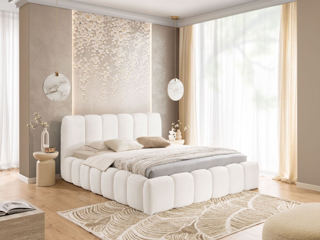 Čalúnenie postele tvorí moderná látka Catch Me 01 v bielom prevedení, ktorá vyniká svojou jemnou buklé štruktúrou. Je príjemná na dotyk, odolná voči opotrebeniu a zároveň pôsobí luxusne. Tento typ látky dodáva posteli útulný charakter a skvele zapadne do moderných aj minimalistických interiérov. Vďaka neutrálnemu odtieňu ju ľahko skombinujete s rôznymi farebnými doplnkami.