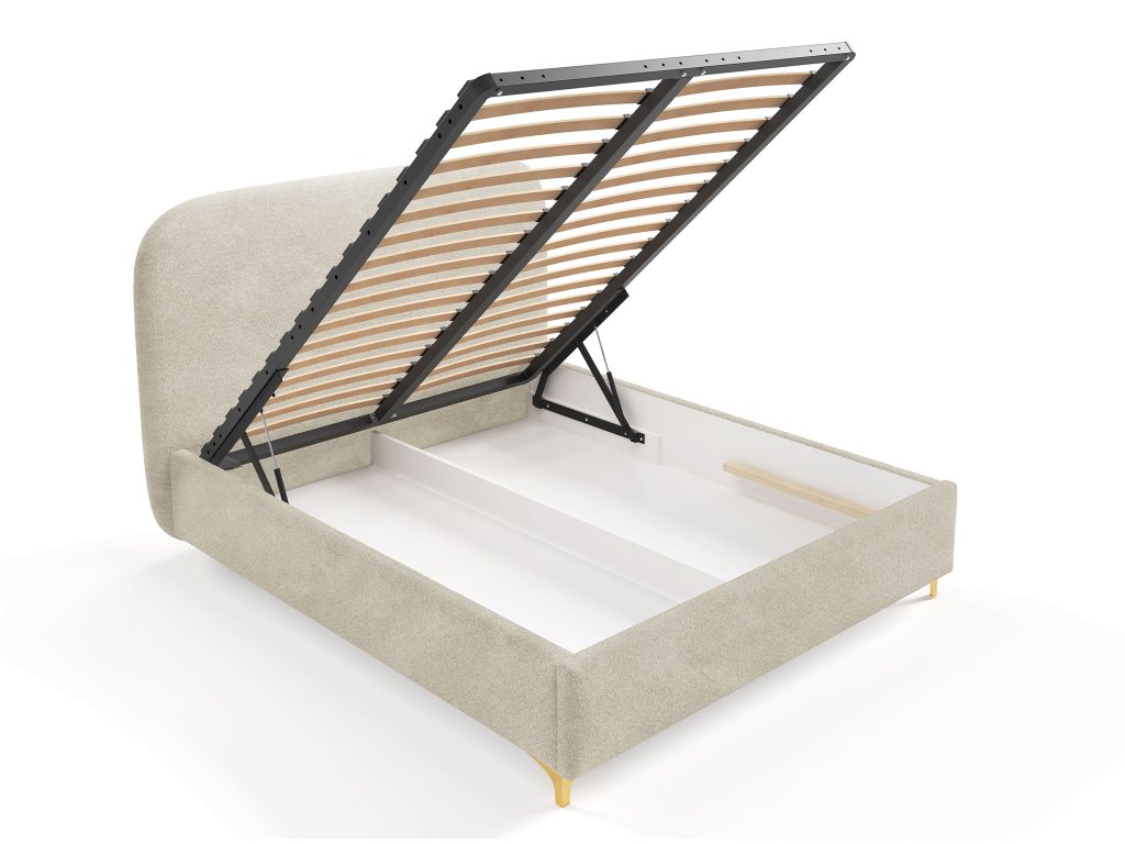 Zlaté kovové nohy dodávajú posteli nielen stabilitu, ale aj štýlový vizuálny akcent, ktorý podčiarkuje jej moderný charakter. Praktický úložný priestor ukrytý pod lôžkom ponúka dostatok miesta na posteľnú bielizeň či sezónne veci, a vďaka silnému plynovému piestu (1000 N) a pohodlnému textilnému úchytu je jeho otváranie jednoduché a bez námahy.
