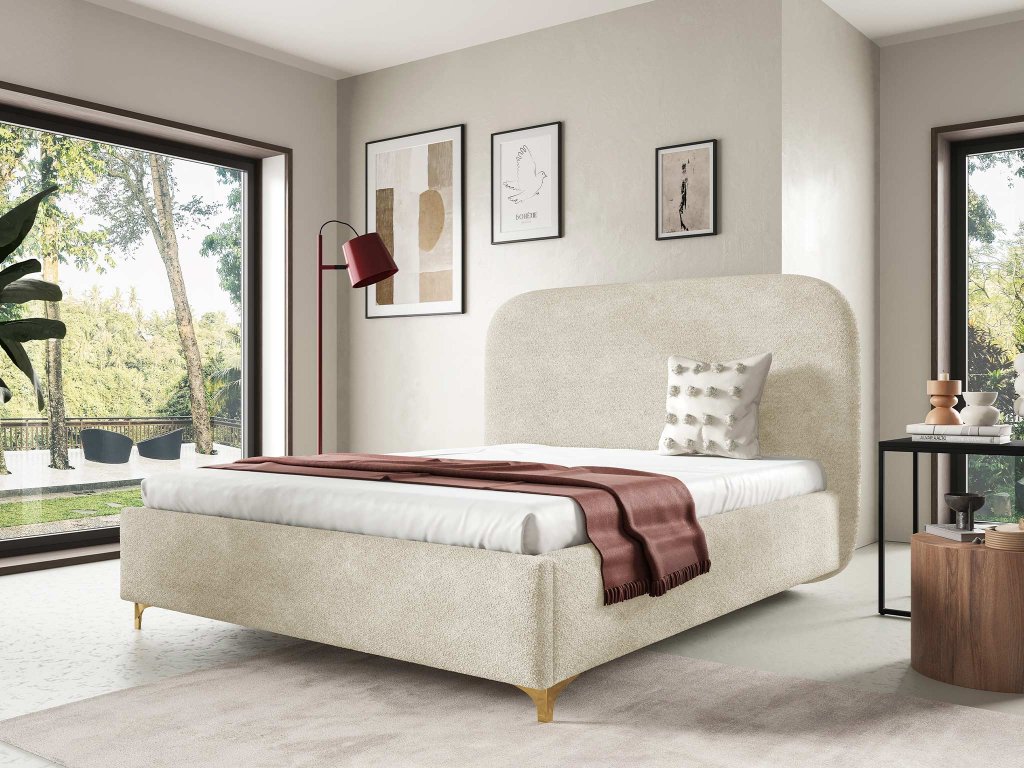 Lunestia 120x200 je štýlová jednolôžková posteľ, ktorá prirodzene zapadne do moderného, škandinávskeho či jemne glamour ladeného interiéru. Jej zaoblené línie a mäkké čalúnenie v krémovej látke Abriamo 03 vytvárajú harmonický kontrast so zlatými kovovými nohami, ktoré jej dodávajú exkluzívny charakter. Vynikne ako elegantné centrum menšej spálne, izby pre hostí, študentského priestoru alebo dizajnového apartmánu, kde sa spája funkčnosť s jemnou estetikou. Výborne sa kombinuje s nočnými stolíkmi v odtieňoch matnej bielej, dubového dreva alebo s prvkami v zlatej či mosadze, ktoré podčiarknu luxusný vzhľad postele.