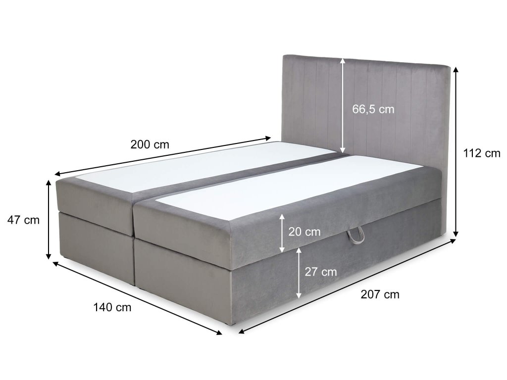 Rám boxspringovej postele je vyrobený z masívneho dreva a laminovanej drevotriesky. Čelo postele je vyrobené z masívneho dreva, pohodlnej peny a krásne prešívaného čalúnenia. Čelo je veľmi stabilné a môžete sa oň bezstarostne oprieť pri čítaní knihy alebo sledovaní TV. Manželská posteľ do spálne má zabudovaný rošt a súčasťou postele sú aj dva 20 cm vysoké a komfortné matrace. Matrace sú tvorené penou T-30 a bonelovými pružinami. Posteľ je čalúnená kvalitnou látkou Royal Velvet, ktorá je príjemne mäkká. Látka je veľmi odolná proti oderu, vydrží až 100 000 cyklov a počas užívania sa nežmolkuje.