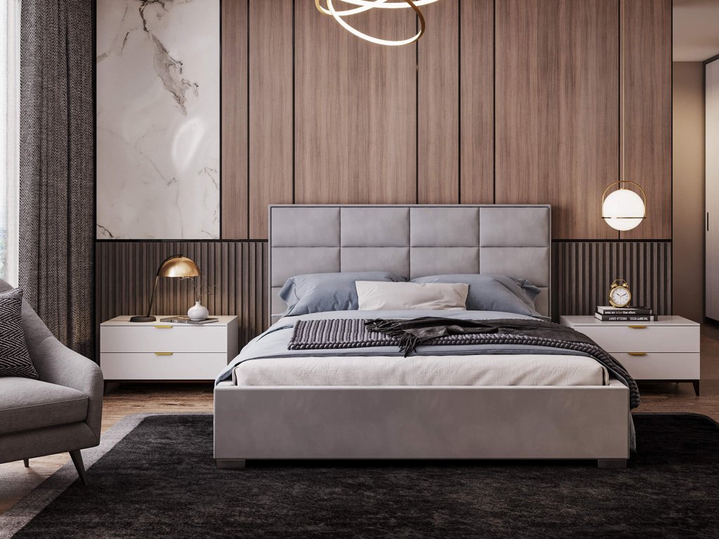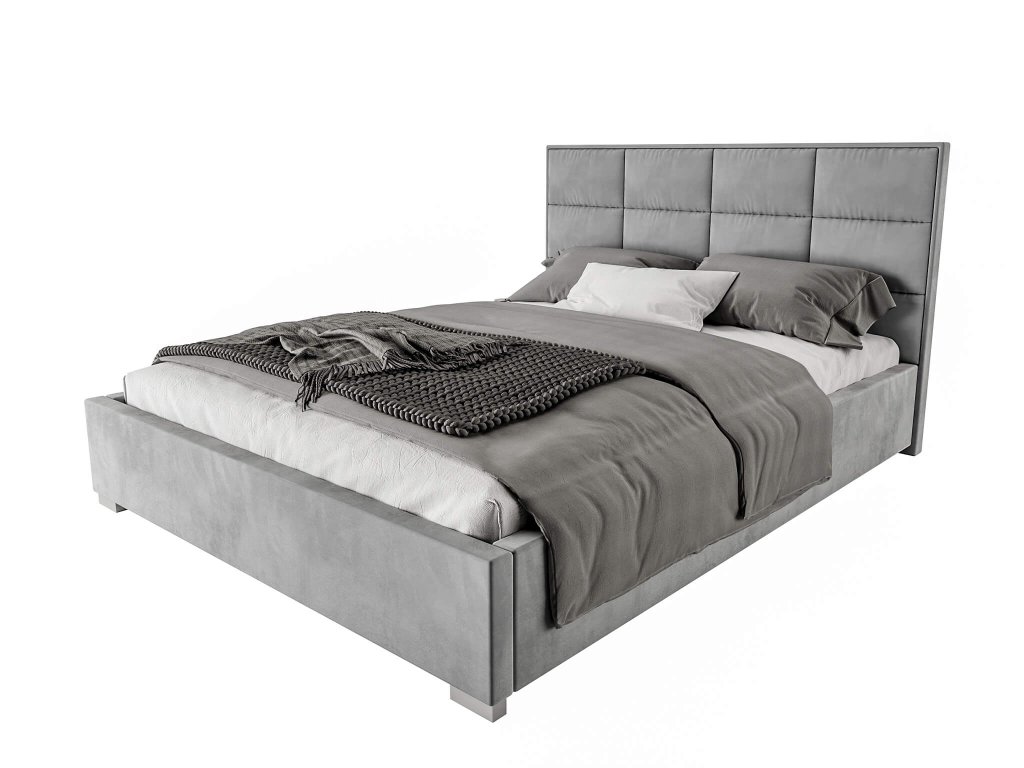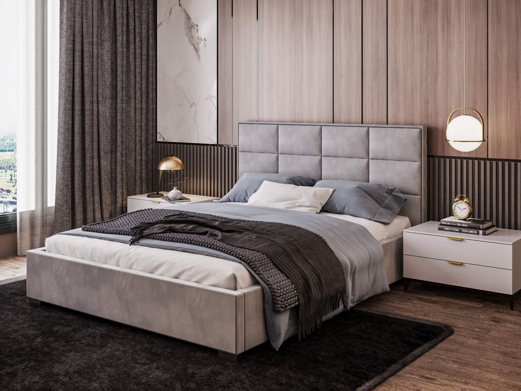 Elegantná čalúnená manželská posteľ Apollo so šedým čalúnením a hranatým posteľovým čelom je peknou voľbou aj do vašej spálne. Čalúnenie posteľového rámu aj posteľového čela je z látky velúr Trinity. Je to materiál veľmi odolný voči oderom, žmolkovaniu a svetlu. Hranaté posteľové čelo s moderným sivým poťahom svojím vzhľadom a prešívaním pripomína dieliky čokolády.