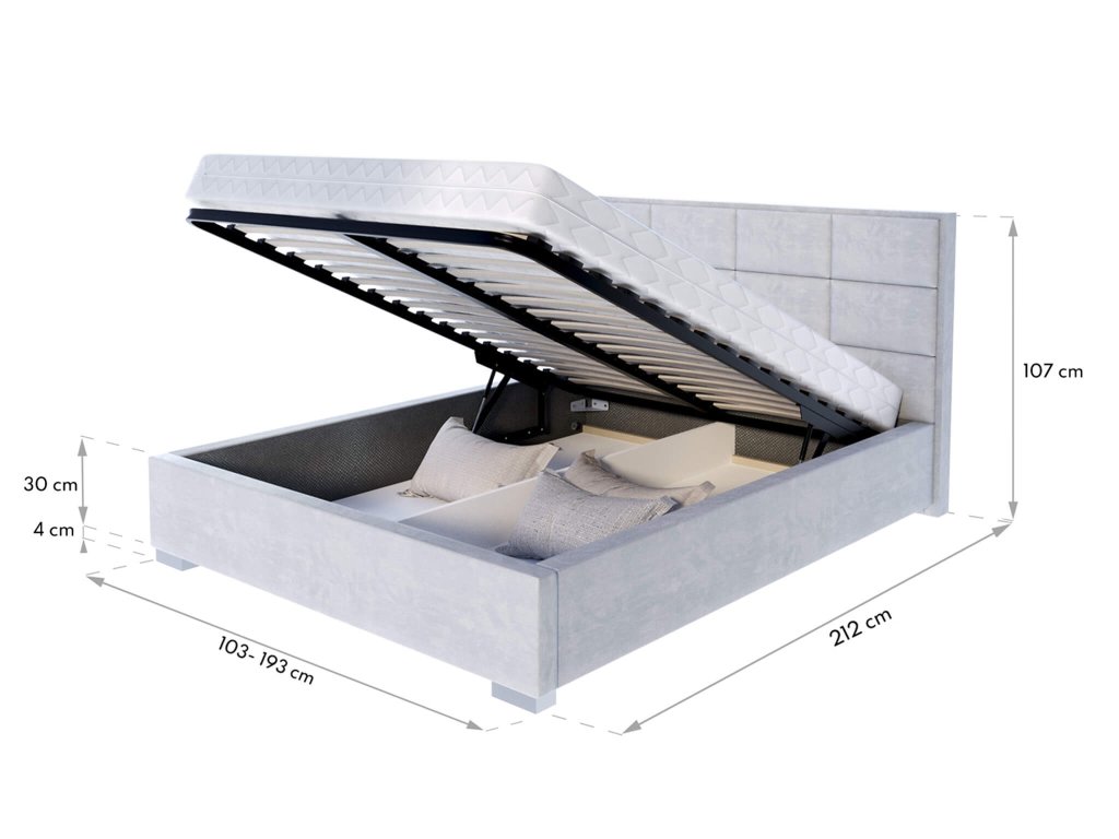 Konštrukcia postele je vyrobená z odolnej dosky, ktorá vám bude dobre slúžiť dlhé roky. Dodatočné výstuže navyše zaistia, že sú všetky diely dobre spojené. Súčasťou postele je lamelový rošt osadený v pevnom kovovom ráme. Celý rošt je možné zdvihnúť a využívať priestor v posteli ako úložný priestor. Úložný priestor je v strede rozdelený na dve časti, čo vám pomôže udržať si v ňom poriadok.