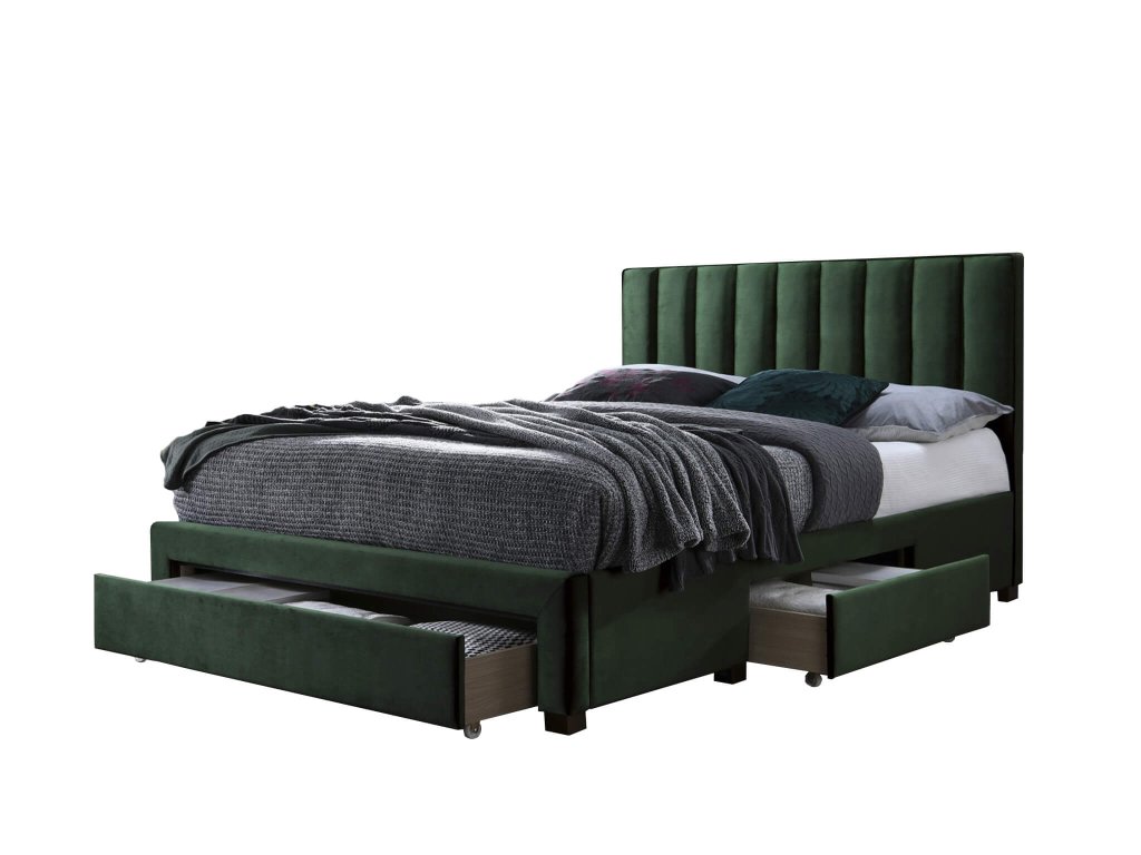 Nadčasová zelená manželská posteľ Grace je kúsok, ktorý bude dokonale vyzerať v každej spálni. Dodajte vašej spálni eleganciu a štýl s našou posteľou, ktorá vám ponúka pohodlné miesto na odpočinok. Je vyrobená z masívneho kaučukového dreva a čalúnená krásnou zelenou velvetovou látkou. Táto látka je veľmi jemná, hebká a príjemná na dotyk. Posteľ je dodávaná s lamelovým roštom, na ktorý sú vhodné penové matrace. Vysoké čelo postele má luxusné dekoratívne vertikálne prešívanie. Čelo postele je skvelé pri večernom čítaní knihy ale aj pri sledovaní televízie. Funkčnosť posteli dodávajú 3 zásuvky, ktoré využijete na odkladanie posteľnej bielizne. Z prednej strany postele je jedna širšia zásuvka. Dve zásuvky sa otvárajú z bočných strán postele. Zásuvky sú postavené na kolieskach pre jednoduchšie otváranie. Precízne prepracovaná manželská posteľ bude stredobodom každej spálne.