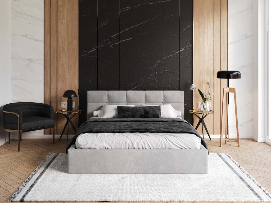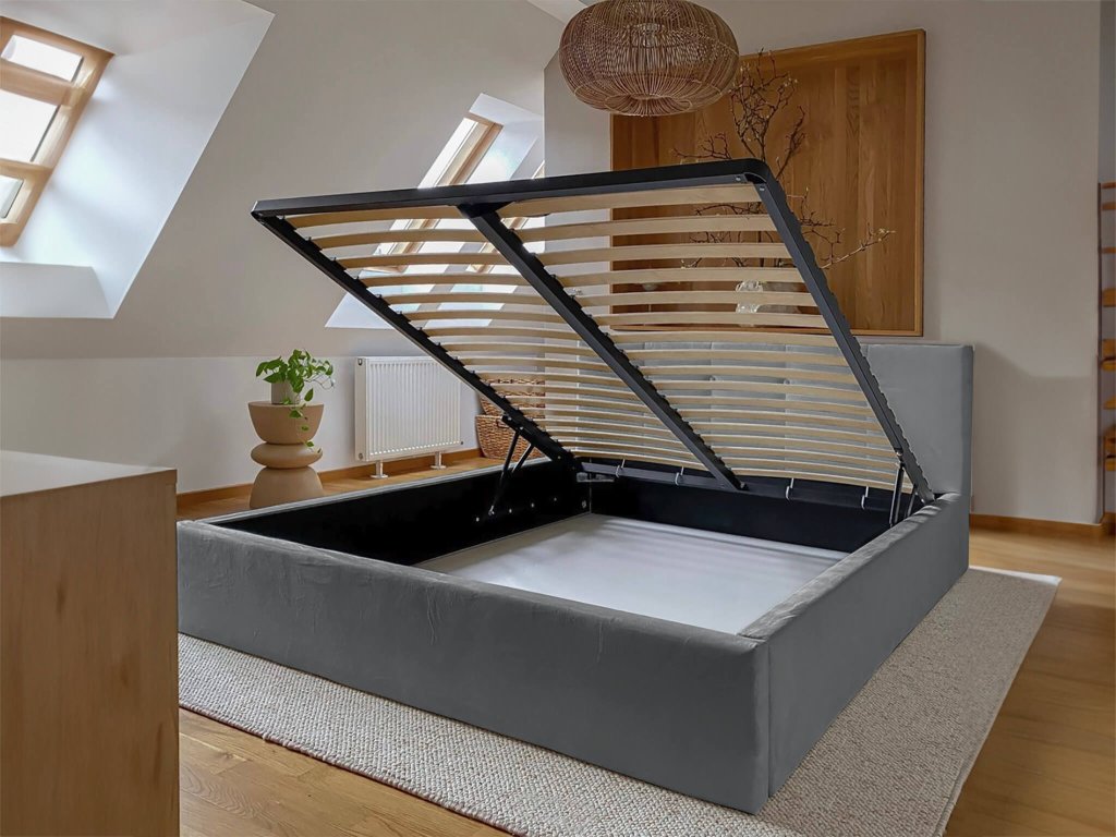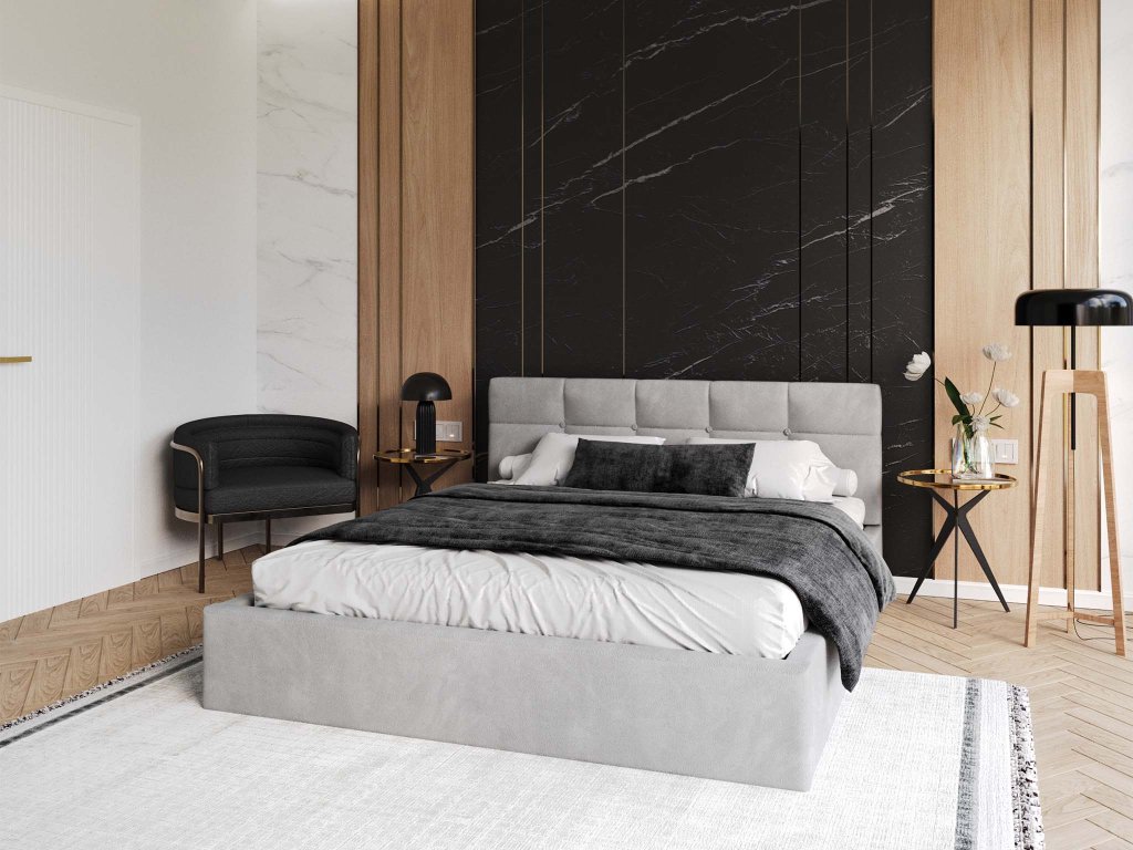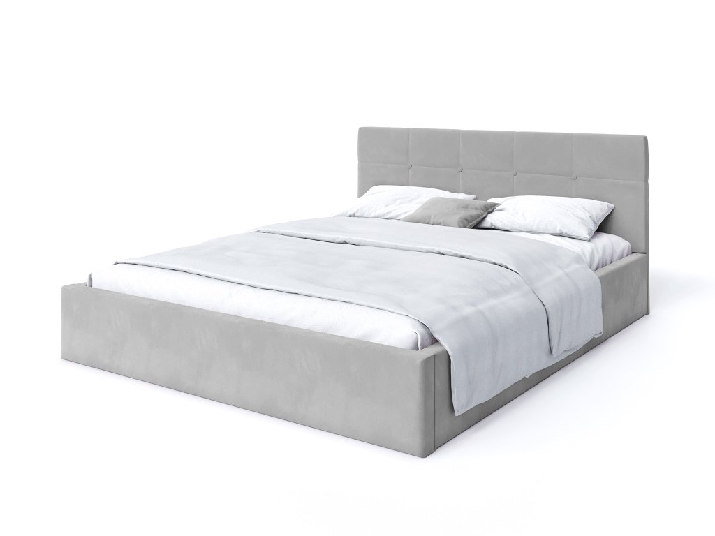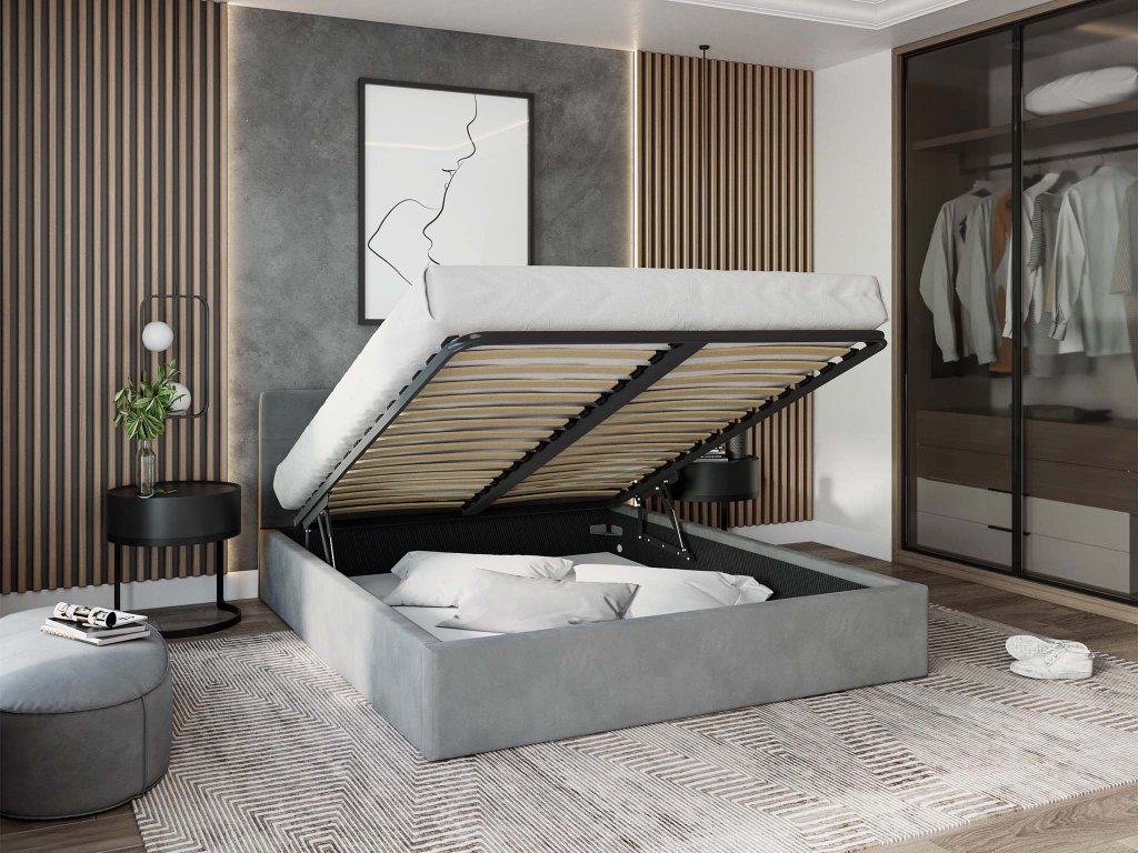 Manželská posteľ vysokým čalúneným čelom poskytuje výbornú podporu pre chrbát pri čítaní kníh. Výhodou postele je veľký úložný priestor, napríklad na posteľnú bielizeň. Posteľ je čalúnená velúrom s moderným vzhľadom, ktorý je veľmi jemný a príjemný na dotyk, odolný voči žmolkovaniu. Posteľ má kovový rám s pružnými brezovými lištami, ktoré sa prispôsobia tlaku tela. Na dvíhanie roštu v posteli sú využívané dva plynové piesty o sile 400N až 1000N/ks, v závislosti od rozmeru postele.