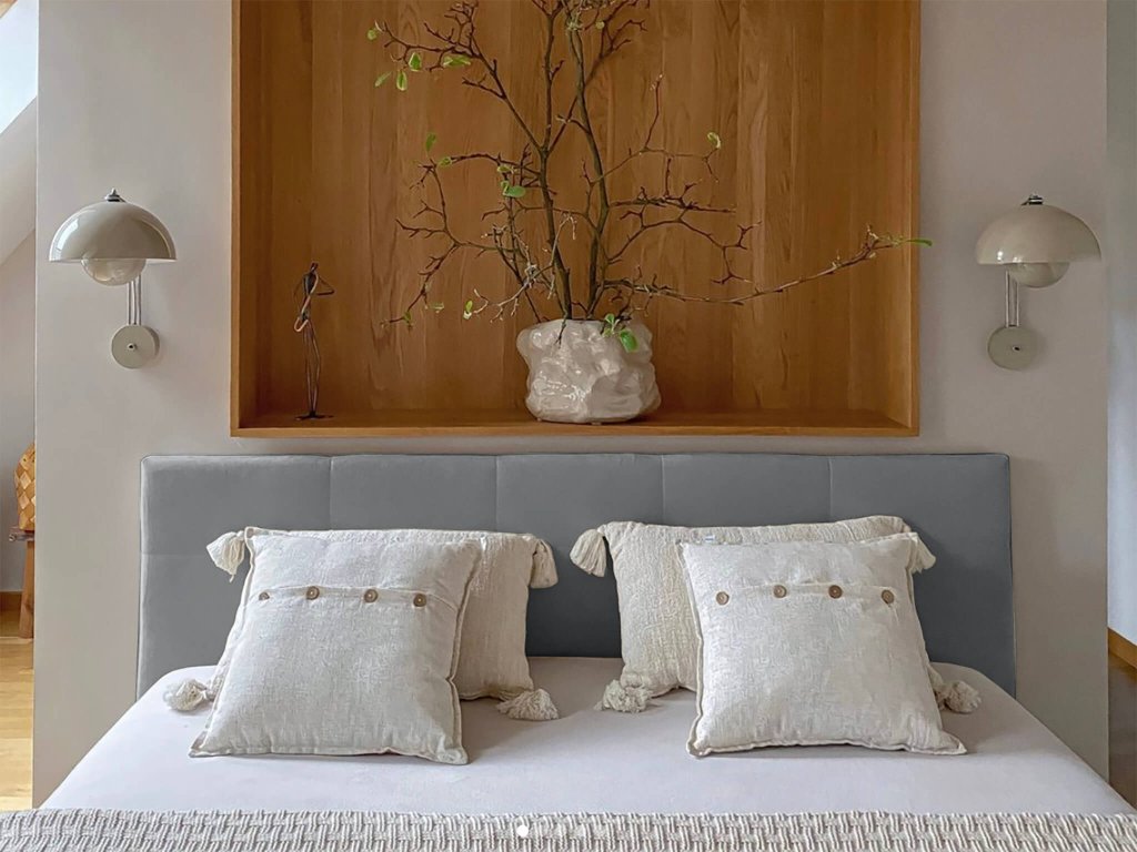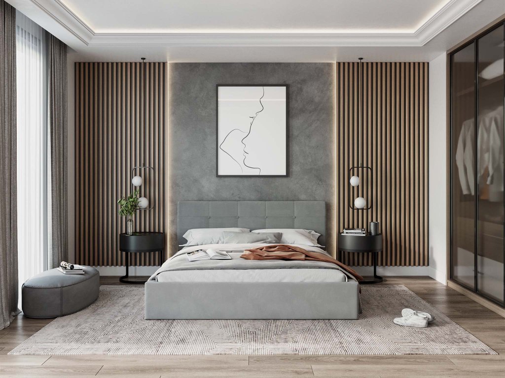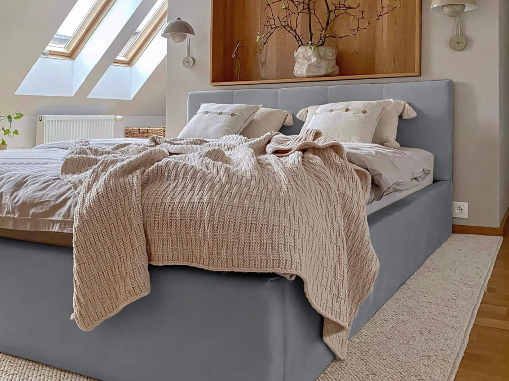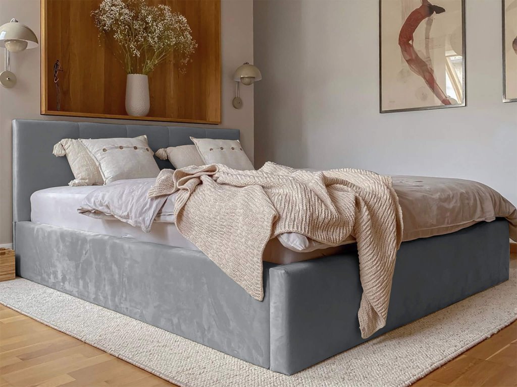 Sivá čalúnená posteľ v minimalistickom dizajne