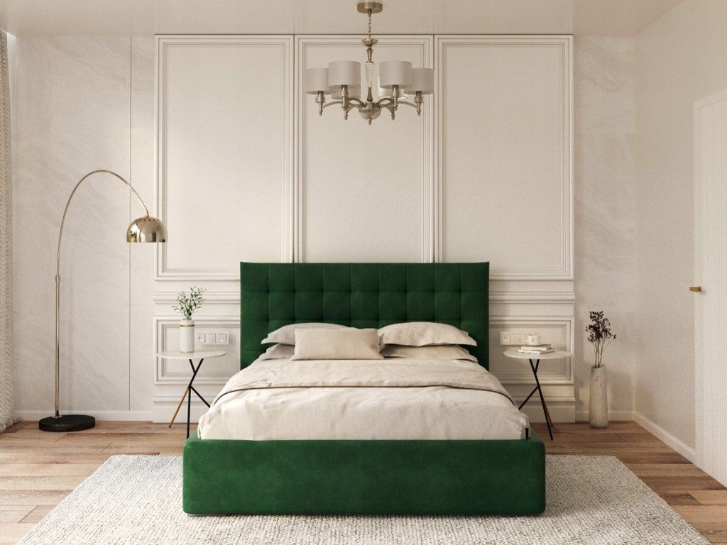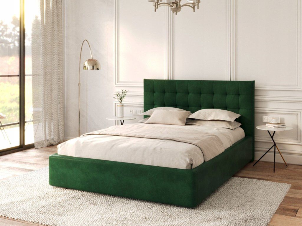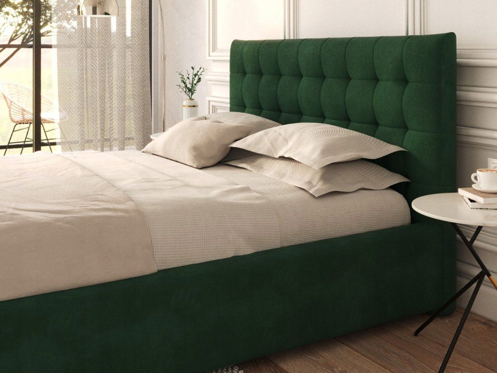 Čalúnenie tvorí kvalitná látka Trinity, ktorá vyniká vysokou odolnosťou voči opotrebovaniu aj žmolkovaniu, pričom si zachováva príjemnú mäkkosť na dotyk. Elegantná zelená farba sa ľahko kombinuje s rôznymi štýlmi zariadenia a dodáva priestoru svieži, moderný charakter. Prešívané čelo postele nielen zvyšuje estetickú hodnotu, ale zároveň poskytuje komfortnú oporu pri oddychu či čítaní.