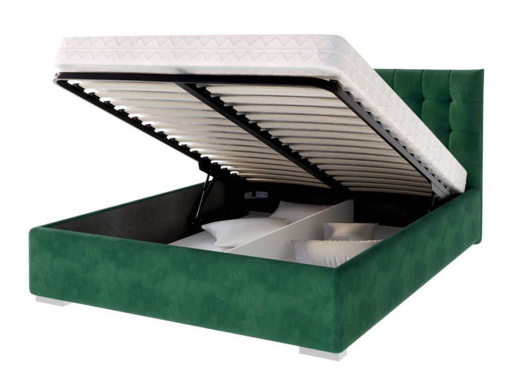 Luxusná čalúnená posteľ Lucerna v sofistikovanom zelenom odtieni prináša do interiéru eleganciu aj praktickosť. Je ideálnou voľbou nielen do spálne, ale aj do hosťovskej izby, kde oceníte jej štýlový vzhľad a premyslené funkcie. Rozmer 160 × 200 cm poskytuje dostatok priestoru pre pohodlný odpočinok. Posteľ je vybavená praktickým zdvíhacím mechanizmom, pod ktorým sa nachádza priestranný úložný priestor. Ten ponúka ideálne miesto na uskladnenie posteľnej bielizne, vankúšov či sezónnych vecí, ktoré chcete mať vždy poruke, no zároveň upratané.