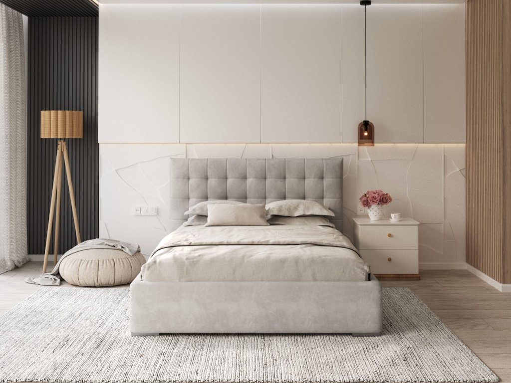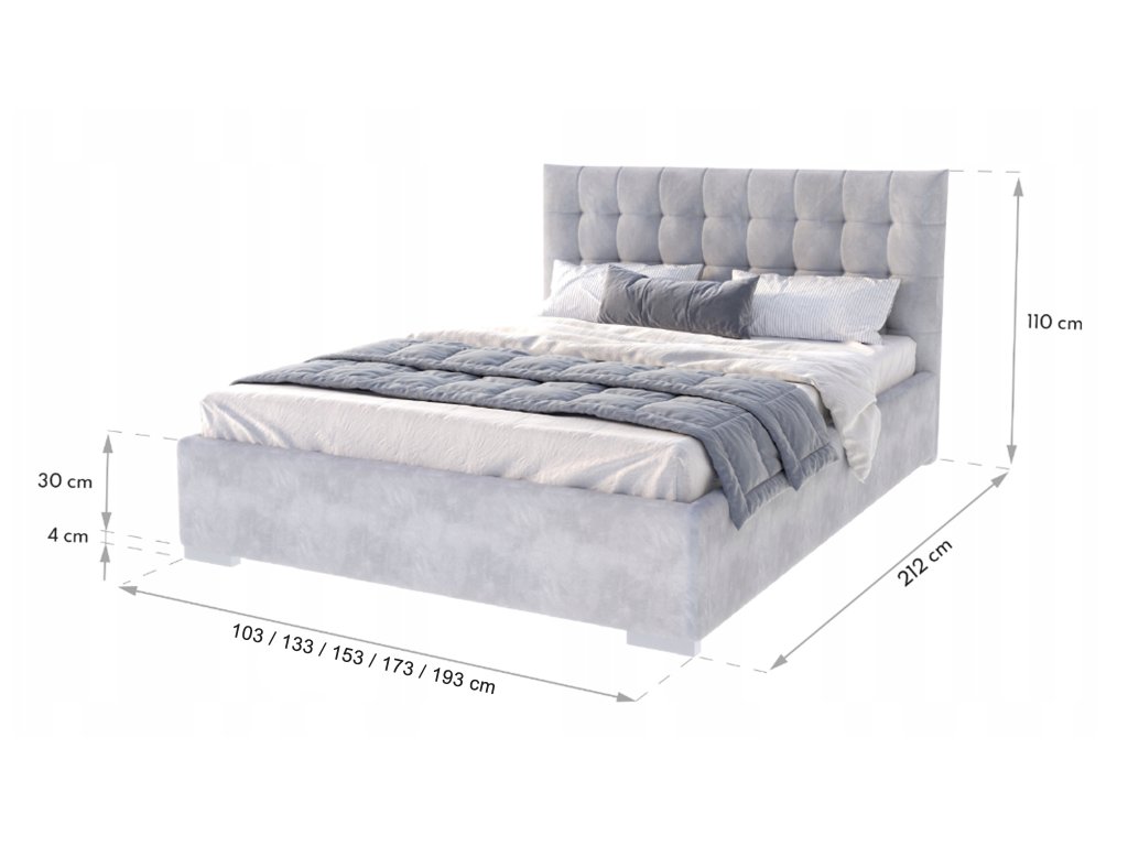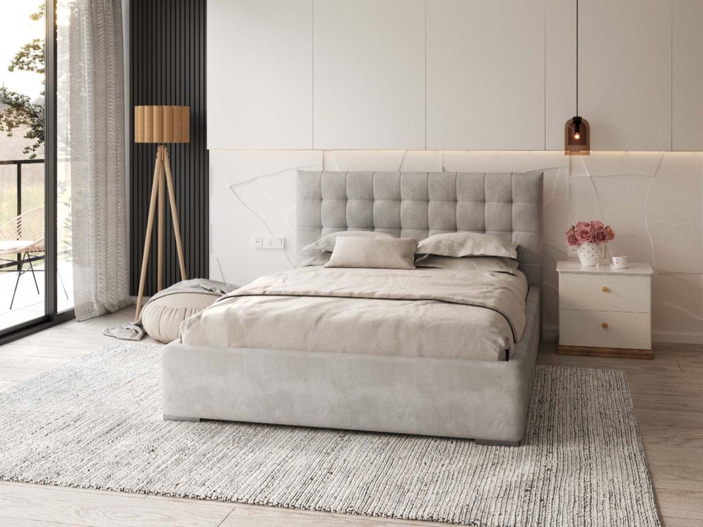 Manželská posteľ má čalúnenie z kvalitnej látky Trinity, ktorá zaručuje odolnosť voči oderu a zaisťuje elegantný vzhľad postele. Sivý odtieň sa ľahko hodí do rôznych interiérov, či už ide o spálňu alebo hosťovskú izbu. Prešívané čelo postele nielenže pridáva estetickú hodnotu, ale zároveň poskytuje pohodlnú oporu pri odpočinku.