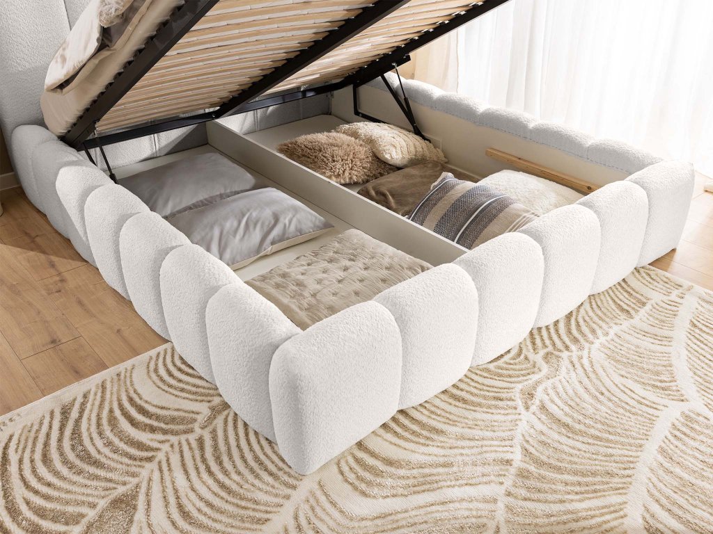 Posteľ je vybavená zdvíhacím mechanizmom s plynovými pružinami, ktorý umožňuje jednoduchý prístup k úložnému priestoru ideálnemu na bielizeň, prikrývky či sezónne oblečenie. Pevná konštrukcia z drevotriesky a kovového rámu spolu s lamelovým roštom zaručuje stabilitu, dlhú životnosť a optimálnu oporu matraca pre zdravý a kvalitný spánok.