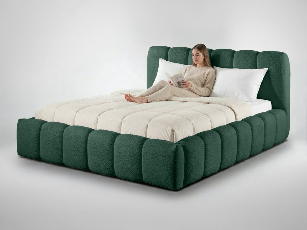 Model postele Micandi v rozmere 160x200 cm prináša ideálnu rovnováhu medzi dizajnom a praktickým využitím. Tmavozelené čalúnenie dodáva posteli výrazný charakter a zároveň pôsobí elegantne a pokojne. Vďaka integrovanému úložnému priestoru so zdvíhacím systémom získate viac miesta bez kompromisov v komforte spánku.