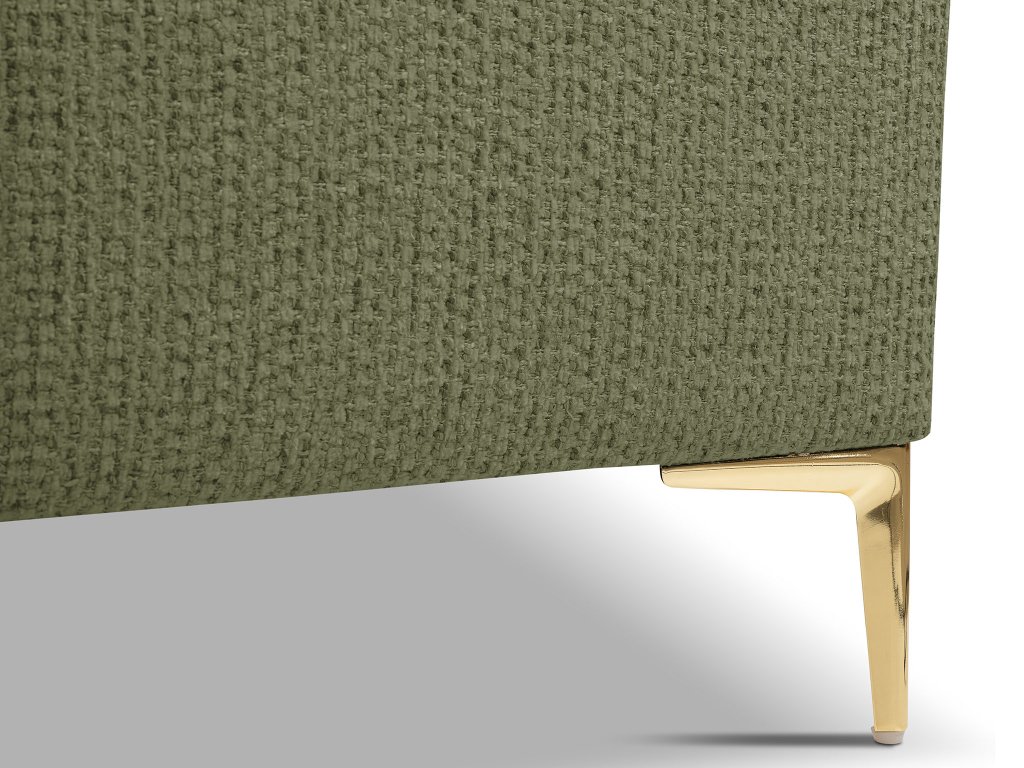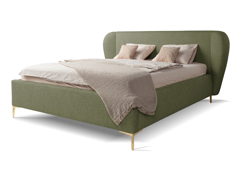 Čalúnená manželská posteľ Aliano v rozmere 160×200 cm v sviežej zelenej farbe prináša do spálne prirodzenú harmóniu a moderný štýl. Mäkké, zaoblené čelo poskytuje pohodlnú oporu pri oddychu, čítaní či sledovaní televízie, zatiaľ čo jemné čalúnenie dodáva posteli útulný a luxusný vzhľad. Zelený odtieň pôsobí harmonicky a elegantne, vďaka čomu sa posteľ stáva dominantným, no vkusným prvkom každého interiéru. Štíhle zlaté nožičky opticky odľahčujú nábytok a podčiarkujú jeho sofistikovaný charakter, pričom pevná konštrukcia zaručuje dlhodobú odolnosť a komfortný spánok.