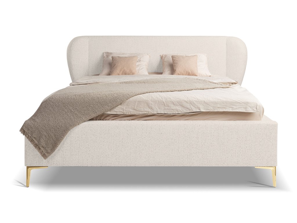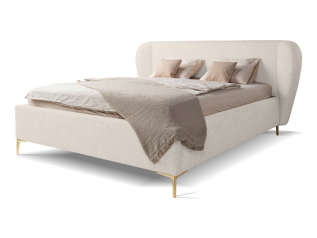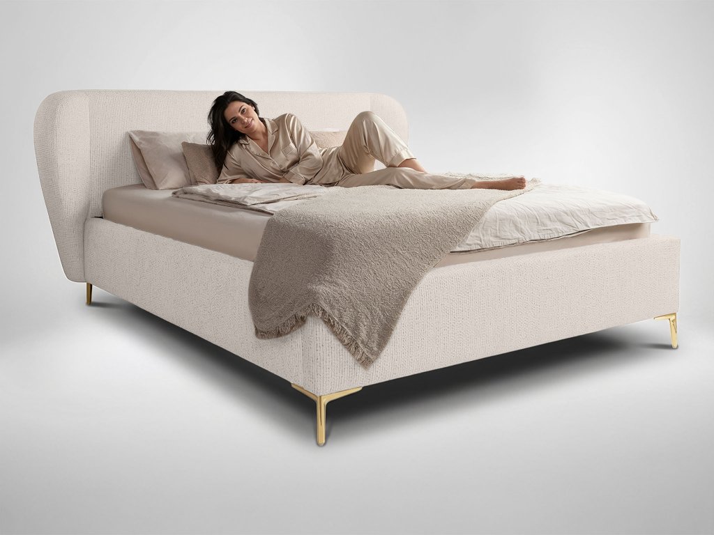Čalúnená manželská posteľ Aliano v rozmere 180x200 cm prináša do spálne jemnú eleganciu a moderný dizajn v dokonale vyváženej podobe. Jej smotanové čalúnenie pôsobí svetlo a vzdušne, vďaka čomu krásne presvetlí interiér a ľahko sa kombinuje s rôznymi štýlmi zariadenia – od minimalistického až po modernú klasiku. Dominantou postele je mäkké, elegantne tvarované čelo s oblými líniami, ktoré vytvára príjemné miesto na večerný oddych, čítanie knihy alebo sledovanie obľúbeného seriálu. Jemné čalúnenie dodáva posteli útulný charakter a zároveň zvyšuje celkový komfort pri používaní. Rozmer 180x200 cm poskytuje veľkorysý priestor na pohodlný spánok pre dvoch. Štíhle zlaté nožičky dodávajú posteli vizuálnu ľahkosť a prinášajú do interiéru decentný nádych luxusu. Stabilná konštrukcia spolu s kvalitným spracovaním zaručuje dlhú životnosť a spoľahlivosť aj pri každodennom používaní.