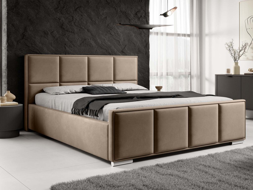 Posteľ Bella v elegantnom orechovom odtieni okamžite upúta svojím príjemným a harmonickým vzhľadom. Kombinácia moderného čalúnenia a jemného tvarovania dodáva posteli komfortný charakter, ktorý sa hodí do útulnej aj minimalistickej spálne. Celej konštrukcii dodávajú ľahkosť a vizuálnu eleganciu chromové nožičky, ktoré zároveň zabezpečujú pevnú oporu.