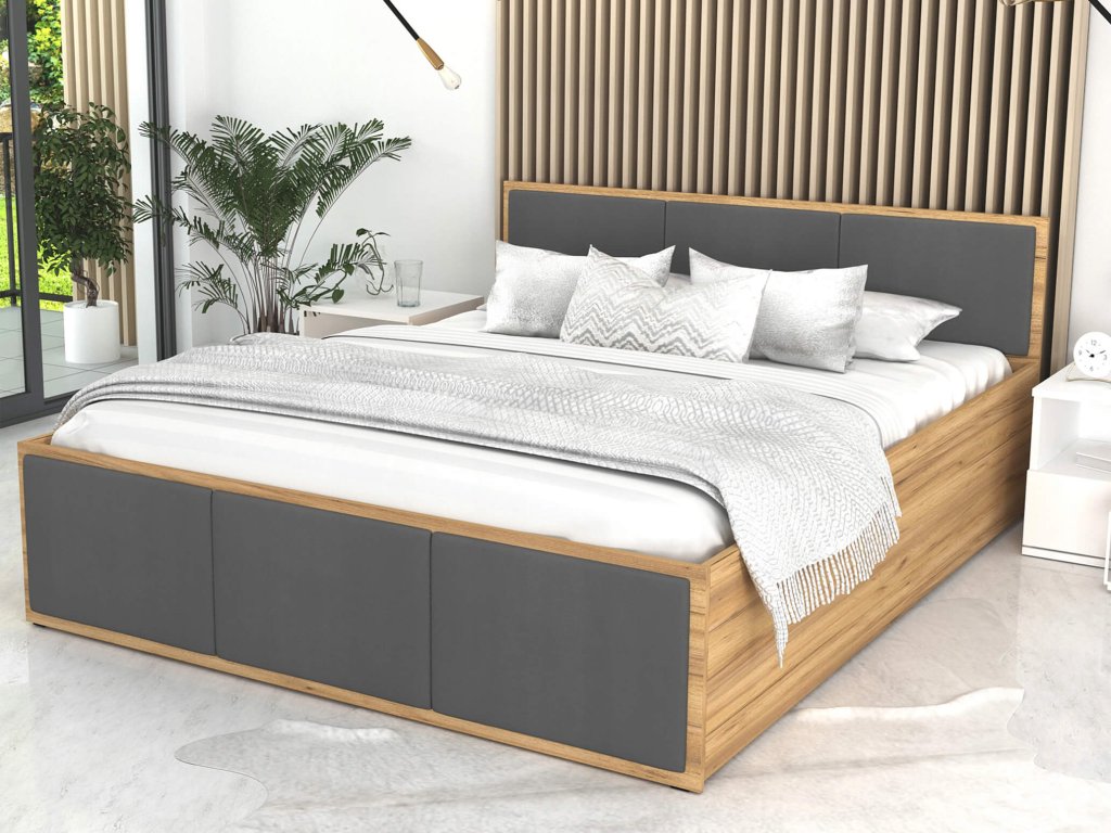 Ak túžite po kvalitnej posteli s čalúnením v minimalistickom dizajne, ale bojujete v menšom byte s nedostatkom priestoru, nezúfajte. Túto manželskú posteľ si môžete vybrať až v troch rozmeroch. Kompaktný variant so šírkou 140 cm sa bez problémov zmestí aj do menšej spálne, kde vám stále zostane dostatok priestoru na komodu, skriňu alebo nočné stolíky. Posteľ máme skladom aj v ďalších dvoch farebných kombináciách – dub craft v kombinácii s bielym čalúnením alebo biela v kombinácii s grafitovým čalúnením.