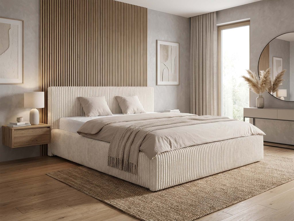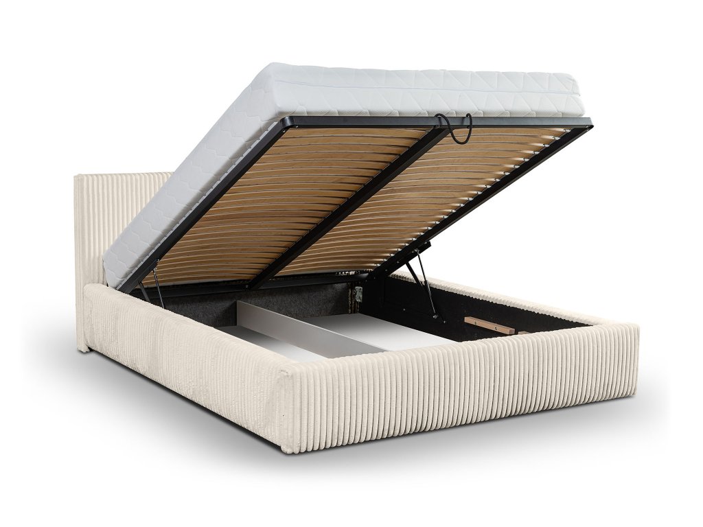 Pod roštom sa nachádza priestranný úložný priestor, ideálny na odkladanie posteľnej bielizne, prikrývok alebo sezónnych vecí. Výklopný mechanizmus umožňuje pohodlnú manipuláciu bez zbytočnej námahy. Odolná polyesterová látka je nielen praktická na údržbu, ale zároveň dodáva posteli Farese elegantný a uhladený vzhľad. Posteľ Farese je harmonickým spojením dizajnu, funkčnosti a pohodlia – riešenie, ktoré premení vašu spálňu na pokojné a štýlové miesto oddychu. Súčasťou postele nie je matrac. Pri kúpe vám odporúčame matrac s minimálnou výškou 9 cm. Keďže manželská posteľ disponuje výklopným roštom je ideálne skombinovať ho s penovými, latexovým alebo kokosovým matracom.