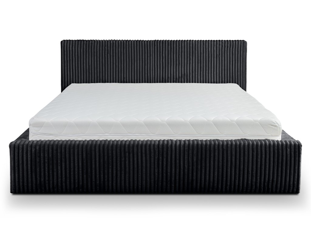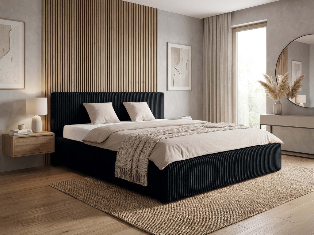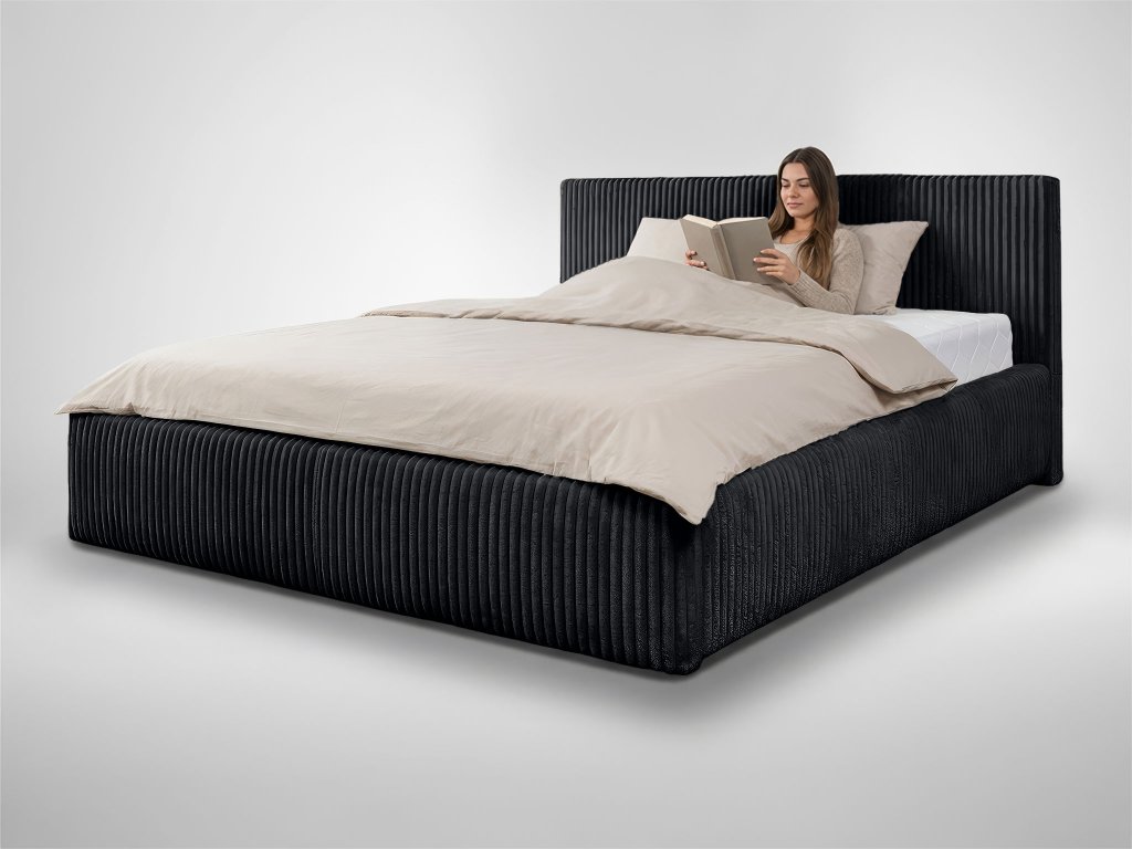 Manželská posteľ Farese v elegantnom čiernom prevedení je výrazným dizajnovým prvkom, ktorý dodá spálni charakter a štýl. Jemne štruktúrované čalúnenie pôsobí luxusne, no zároveň decentne, vďaka čomu posteľ prirodzene zapadne do moderných, industriálnych aj minimalistických interiérov. Priestranný rozmer 180 × 200 cm ponúka veľkorysé miesto na pohodlný spánok bez kompromisov a ideálne podmienky na dokonalý oddych vo dvojici. Stabilná konštrukcia z kvalitného dreva a laminovanej dosky zaisťuje pevnosť, odolnosť a dlhodobú spoľahlivosť. Kovový výklopný rošt nielen správne podopiera matrac, ale zároveň umožňuje jednoduchý prístup k praktickému úložnému priestoru, ktorý oceníte na uloženie posteľnej bielizne či objemnejších vecí. Komfort pri každodennom používaní zvyšuje mäkká PUR pena, vďaka ktorej je posteľ príjemná na ležanie aj opretie počas relaxu.