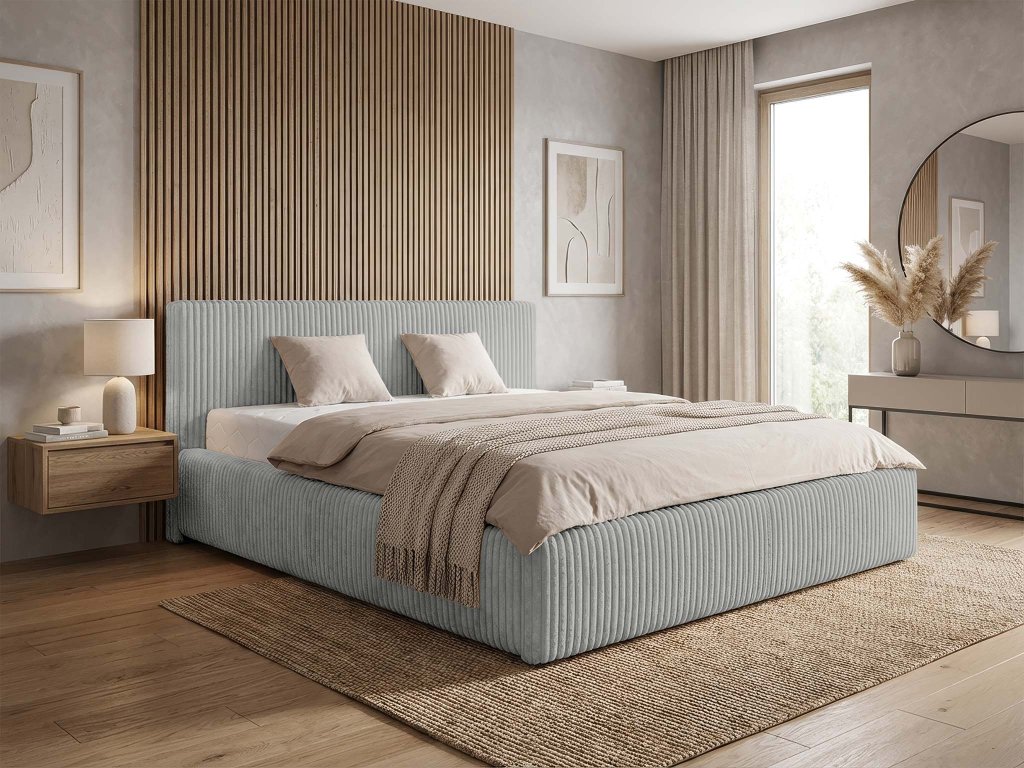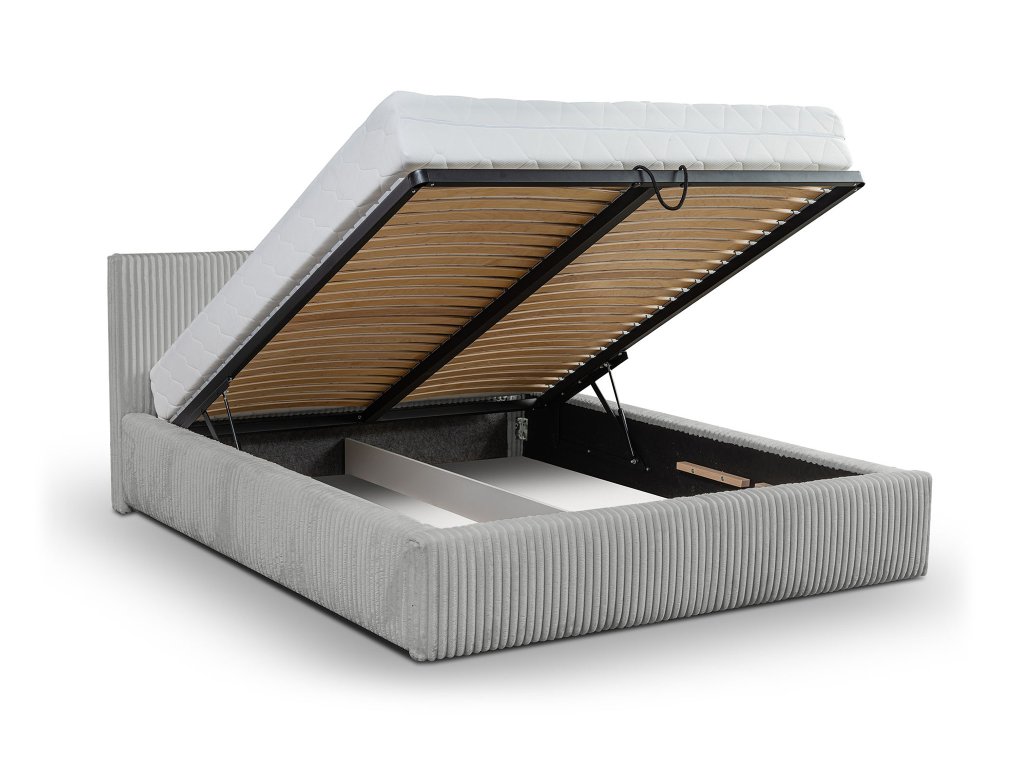Pod roštom sa nachádza priestranný úložný priestor, ideálny na odkladanie posteľnej bielizne, prikrývok alebo sezónnych vecí. Výklopný mechanizmus umožňuje pohodlnú manipuláciu bez zbytočnej námahy. Odolná polyesterová látka je nielen praktická na údržbu, ale zároveň dodáva posteli Farese elegantný a uhladený vzhľad. Posteľ Farese je harmonickým spojením dizajnu, funkčnosti a pohodlia – riešenie, ktoré premení vašu spálňu na pokojné a štýlové miesto oddychu. Súčasťou postele nie je matrac. Pri kúpe vám odporúčame matrac s minimálnou výškou 9 cm. Keďže manželská posteľ disponuje výklopným roštom je ideálne skombinovať ho s penovými, latexovým alebo kokosovým matracom.