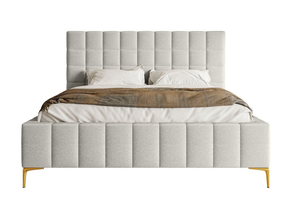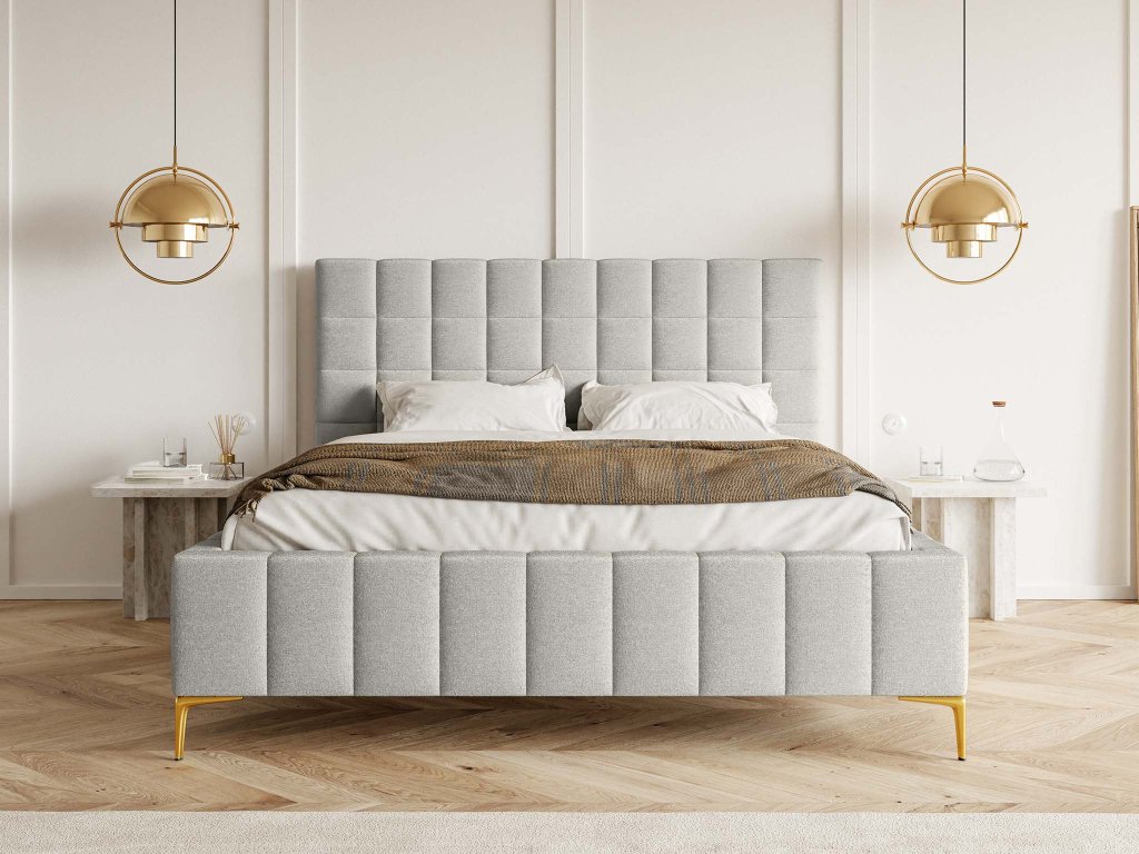 Celočalúnená posteľ Greid v čistom bielom odtieni prináša do spálne pocit sviežosti, svetla a nadčasového štýlu. Biela farba pôsobí elegantne a harmonicky, ľahko sa kombinuje s drevom, neutrálnymi tónmi aj zlatými či kovovými doplnkami. Čalúnené čelo s jemným prešívaním dodáva posteli luxusný vzhľad a poskytuje pohodlnú oporu pri oddychu alebo večernom čítaní. Pevná konštrukcia zabezpečuje stabilitu a dlhú životnosť, zatiaľ čo mäkké čalúnenie zvyšuje komfort spánku. Elegantné zlaté nožičky dodávajú posteli ľahkosť a moderný charakter, pričom uľahčujú upratovanie pod posteľou. Rozmer 140 × 200 cm ponúka dostatok miesta pre pohodlný spánok a robí z postele Greid ideálnu voľbu pre tých, ktorí hľadajú spojenie luxusu, štýlu a každodenného komfortu.