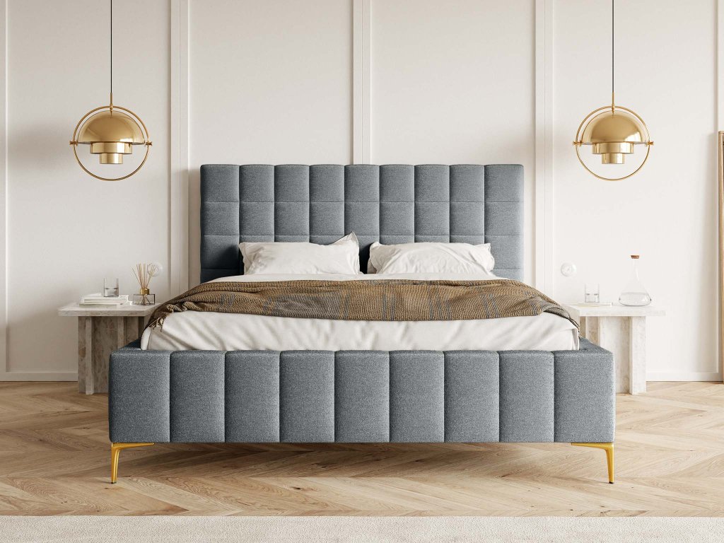 Manželská posteľ Greid v elegantnej sivej farbe spája moderný dizajn, nadčasovú estetiku a maximálny komfort. Jemný sivý odtieň pôsobí pokojne a harmonicky, opticky zväčšuje priestor a ľahko sa kombinuje s drevom, kovom či neutrálnymi doplnkami. Čalúnené čelo s jemným prešívaním dodáva posteli štýlový vzhľad a pohodlie pri opieraní.