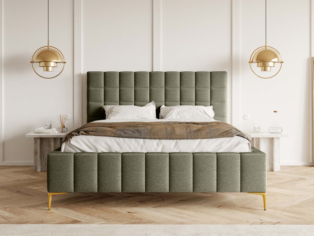 Posteľ Greid – moderný štýl v olivovom tóne so zlatým detailom