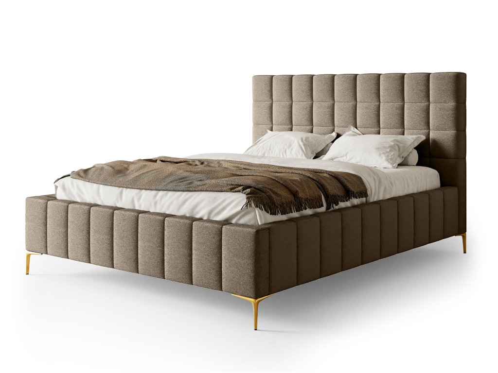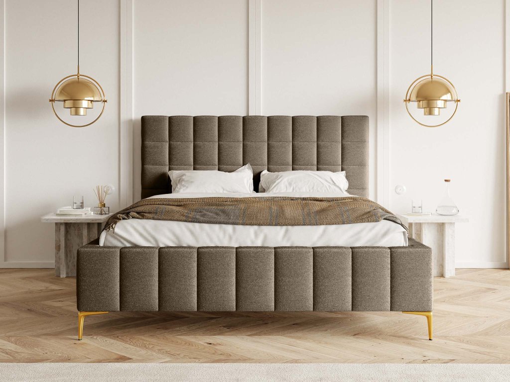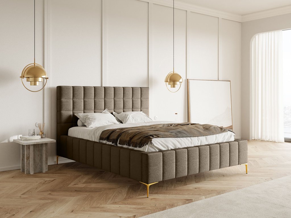 Manželská posteľ Greid v teplom, hrejivom hnedom odtieni vnáša do spálne pocit pohody, luxusu a útulnej atmosféry. Hnedá farba harmonicky ladí s drevenými prvkami, neutrálnymi tónmi aj zlatými alebo kovovými doplnkami, a dodáva priestoru nadčasový šarm. Čalúnené čelo s jemným prešívaním pôsobí elegantne a poskytuje pohodlnú oporu pri čítaní, relaxe či len takom oddychu po náročnom dni. Stabilná a pevná konštrukcia zaručuje dlhú životnosť, zatiaľ čo mäkké čalúnenie sa stará o maximálny komfort spánku. Štýlové zlaté nožičky dodávajú posteli ľahkosť a moderný nádych, zároveň uľahčujú upratovanie pod posteľou. Veľkorysý rozmer 180 × 200 cm poskytuje dostatok priestoru pre pohodlný a ničím nerušený spánok dvoch osôb a robí z postele Greid ideálny kúsok pre tých, ktorí túžia po dokonalom spojení štýlu, luxusu a každodenného komfortu.