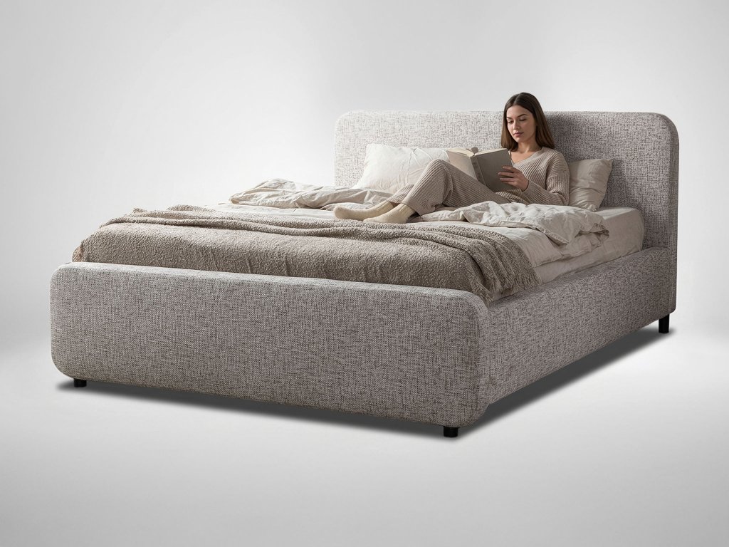 Súčasťou postele je aj úložný priestor umiestnený pod roštom. Otváranie je jednoduché a pohodlné vďaka výklopnému mechanizmu. Povrch tvorí látka Imo z polyesteru, ktorá je príjemná na dotyk a má jemne štruktúrovaný vzor. Táto čalúnená posteľ spája pohodlie, funkčnosť a nadčasový vzhľad v jednom.