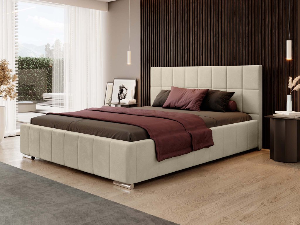 Posteľ je potiahnutá obľúbenou zamatovou látkou Kronos, ktorá sa stala synonymom pre luxus a dlhú životnosť. Smotanová farba v kombinácii s leskom látky Kronos vytvára hrejivý a exkluzívny vizuálny efekt, ktorý zútulní každú spálňu. Tento model myslí aj na praktickosť: súčasťou je priestranný úložný priestor pod celou plochou, ktorý sa ľahko otvára pomocou kovového výklopného roštu vybaveného silnými plynovými piestami. Týmto získate efektívne riešenie pre uloženie posteľnej bielizne alebo sezónnych vecí, čo je kľúčové pre funkčnú spálňu.