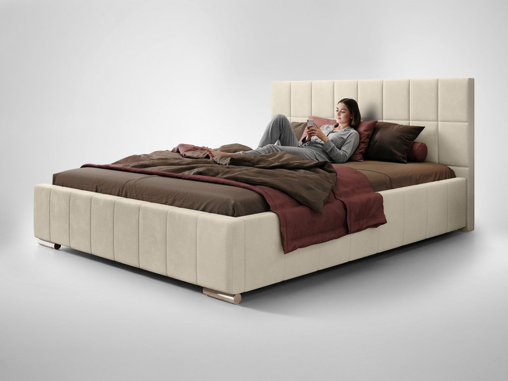 Táto elegantná čalúnená posteľ v smotanovom odtieni prinesie do vašej spálne jas a pocit čistoty. Rozmer 140x200 cm je ideálny pre tých, ktorí hľadajú kompaktnú, no priestrannú spaciu plochu. Masívne čelo, zdobené štvorcovým prešívaním, tvorí dominantný prvok, ktorý zároveň poskytuje komfortnú opierku hlavy a chráni stenu pred odermi. Konštrukcia je postavená na pevnom ráme z kvalitnej bielej laminovanej dosky a drevených prvkov, čo zaručuje mimoriadnu pevnosť celej postele. Výška prednej časti s nožičkami (35,5 cm) uľahčuje vstávanie.