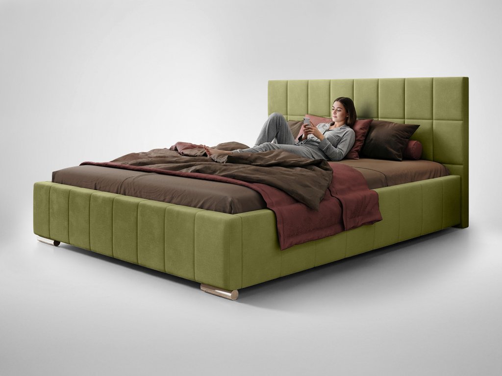 Látka Kronos, ktorou je posteľ potiahnutá, je skutočným vizuálnym a hmatovým zážitkom. Táto kvalitná poťahová látka sa vyznačuje jemnou, zamatovou textúrou, ktorá je neuveriteľne príjemná na dotyk a zároveň vysoko odolná (napr. voči žmolkovaniu). Zelený odtieň látky sa mení v závislosti od svetla, čím dodáva lôžku dynamický a luxusný vzhľad. Pod matracovou plochou sa nachádza veľký úložný priestor, ktorý je vďaka plynovým piestom na kovovom rošte ľahko dostupný. Tento box na posteľnú bielizeň je kľúčový pre organizáciu a poriadok v každej modernej spálni.