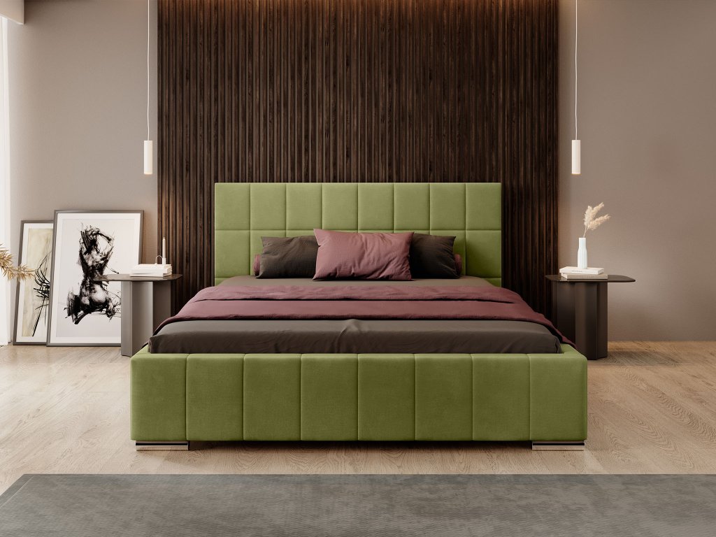 Čalúnenie postele zabezpečuje prémiová zamatová látka Kronos. Kronos je známa svojou výnimočnou mäkkosťou na dotyk a vysokou odolnosťou, ktorá dlhodobo udržuje estetickú hodnotu nábytku. Manželská posteľ je vybavená veľkoobjemovým úložným priestorom prístupným zdvihnutím kovového roštu pomocou plynových piestov. Tento mechanizmus umožňuje ľahký a rýchly prístup k uskladneným veciam a podčiarkuje funkčnosť tohto luxusného modelu. Získate tak nielen štýlové lôžko, ale aj efektívneho pomocníka pre organizáciu domácnosti.