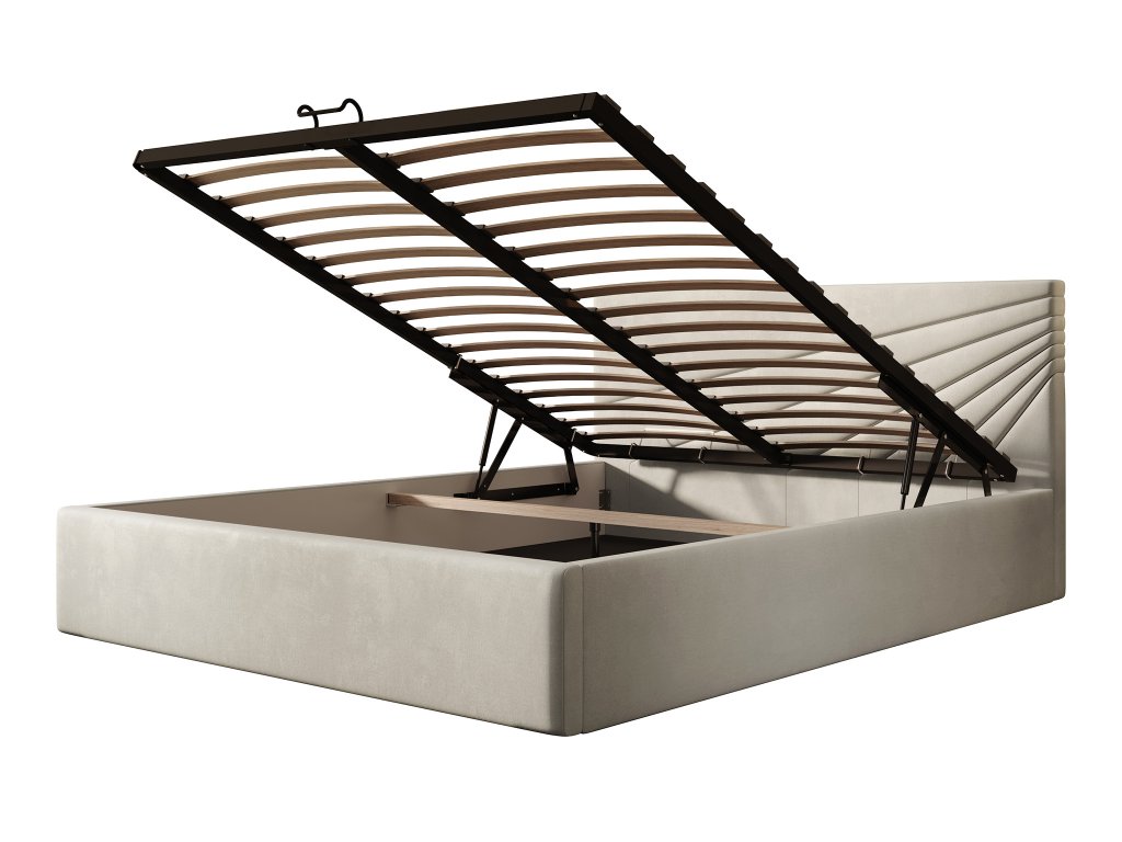 Posteľ je vybavená výklopným kovovým roštom s plynovými pružinami, ktoré umožňujú jednoduché a plynulé zdvíhanie. Pod roštom sa nachádza priestranný úložný priestor z HDF dosky, vhodný na uloženie posteľnej bielizne, sezónnych doplnkov alebo vecí, ktoré chcete mať poruke, no mimo dohľadu. Rám postele z laminovanej dosky zaisťuje stabilitu celej konštrukcie a zároveň umožňuje cirkuláciu vzduchu pod matracom, čím prispieva k udržiavaniu suchého prostredia a predlžuje životnosť matraca. Povrch rámu je doplnený vrstvou peny a vaty, ktorá zvyšuje pohodlie pri kontakte s čalúnenými časťami. Namiesto klasických nôh sú použité pevné klzáky, ktoré zlepšujú stabilitu a uľahčujú manipuláciu aj upratovanie pod posteľou.