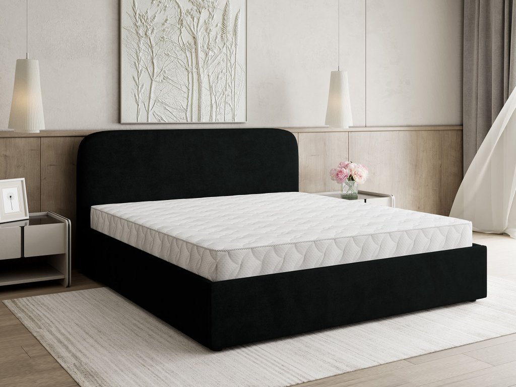Ak hľadáte spojenie minimalizmu a praktického využitia, čierna manželská posteľ Renive K 140x200 je ideálnou voľbou. Vysoké čelo s mäkkým čalúnením je komfortným doplnkom pri relaxácii a dodáva celej posteli moderný vzhľad. Zdvíhací kovový rám s lamelami vytvára nielen pevnú oporu pre matrac, ale poskytuje aj priestranný úložný priestor, do ktorého odložíte všetko, čo potrebujete mať poruke, ale nie na očiach. Čierny odtieň pôsobí sofistikovane a elegantne, takže sa hodí do moderných interiérov, kde vynikne jeho jednoduchý dizajn. Táto posteľ vám poskytne nielen pohodlný spánok, ale aj praktické riešenie pre organizáciu spálne.