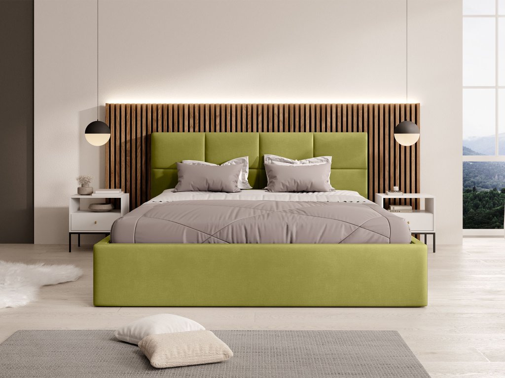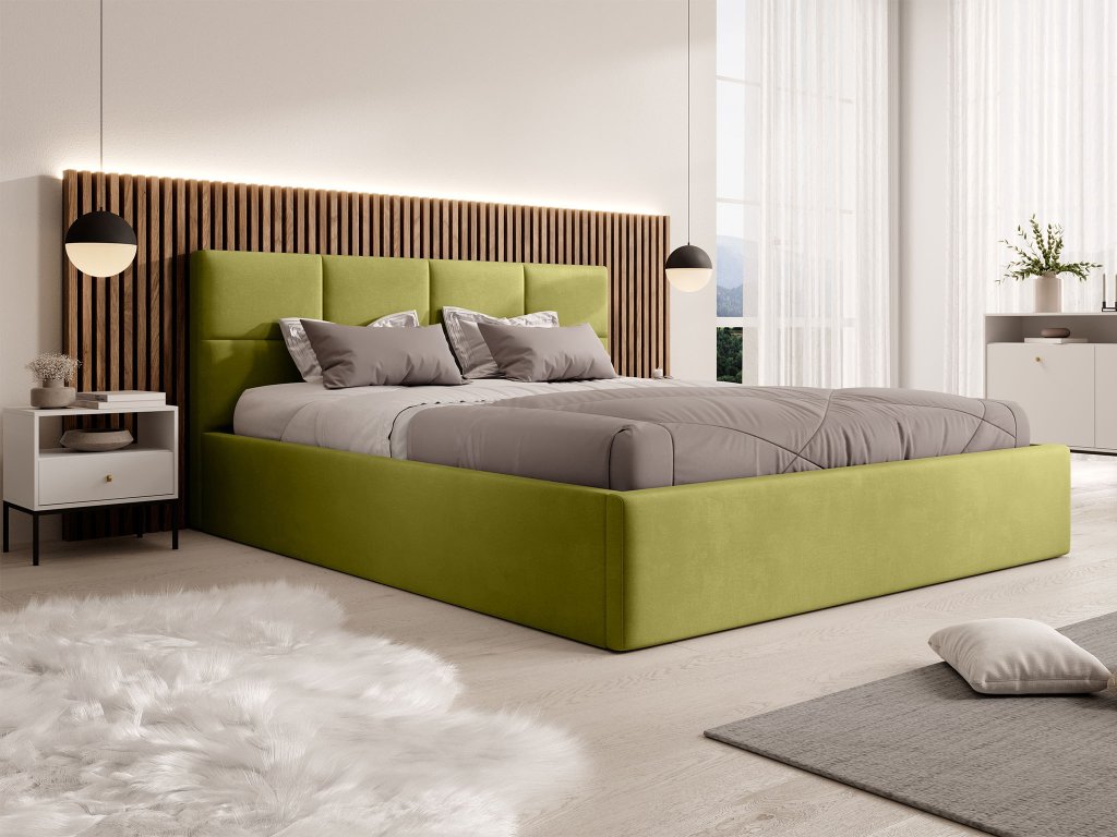 Olivová čalúnená posteľ Rinimi Slim na prvý pohľad zaujme svojím čistým, elegantným prevedením, ktoré pôsobí moderne a zároveň útulne. Vysoké čelo s decentným obdĺžnikovým prešívaním dodáva posteli šmrnc a poskytuje ideálnu oporu pri čítaní či relaxovaní. Pevná konštrukcia z kombinácie dreva a laminovanej dosky zabezpečuje stabilitu, dlhú životnosť a správne odvetrávanie matraca. Posteľ je vybavená klzákmi a ponúka veľkorysý úložný priestor, ktorý sa vďaka plynovým vzperám otvára hladko, ľahko a bez námahy.