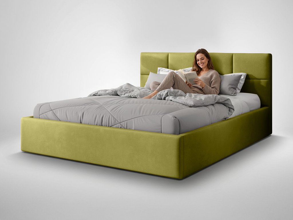 Olivová posteľ Rinimi Slim v rozmere 160×200 cm okamžite zaujme svojou harmonickou kombináciou moderného štýlu a príjemnej útulnosti. Čisté línie dopĺňa vysoké čelo s jemným obdĺžnikovým prešívaním, ktoré posteli dodáva charakter a zároveň poskytuje komfortnú oporu pri čítaní aj oddychu. Pevná konštrukcia z kombinácie dreva a laminovanej dosky zabezpečuje stabilitu, dlhú životnosť a správne odvetrávanie matraca. Posteľ je vybavená klzákmi a ponúka veľkorysý úložný priestor, ktorý sa vďaka plynovým vzperám otvára hladko, ľahko a bez námahy.